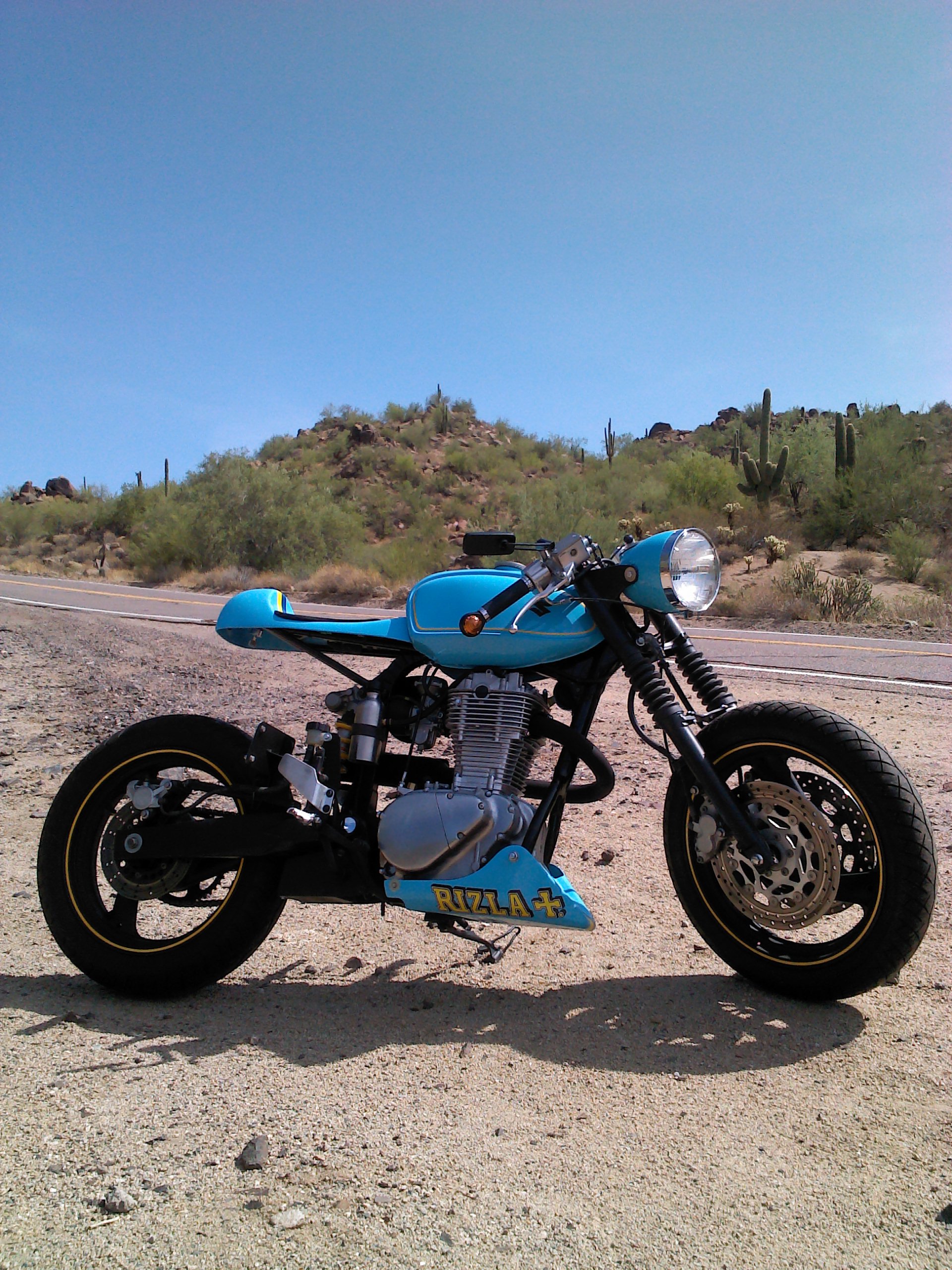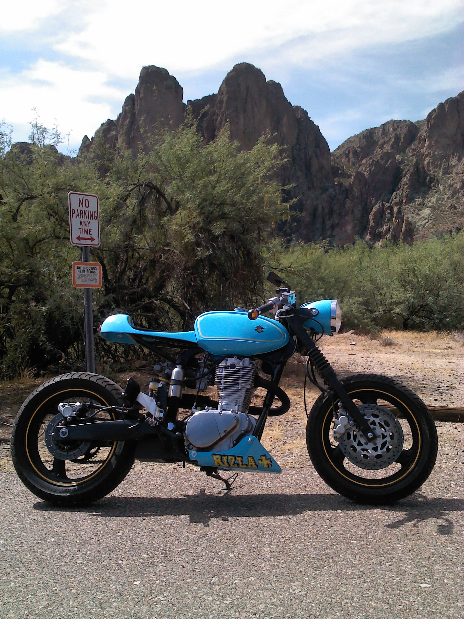 The rear-sets and controls come complete from the donor FZR600 that I found out in the yard at Bob's Used Cycle Parts in Phoenix, it's a great place for dreaming. The foot-peg mounts are kind of hard to describe, I think you just have to be creative here or buy the Ryca items. I welded 1/8" steel tabs to the frame tubes using the existing muffler mount tab as one tab, for example. To these I mount both the battery box and separately a cross-tube for the foot pegs. This cross tube is lower than ideal and I used bicycle pedal cranks to raise the peg height and this also clears the chain. Kick-stand is a bolt on item from some long-deceased Honda at Bob's. I just welded nuts to the lower frame tube on the LH side, seems to work fine after some adjustment to keep it from dragging in left turns. I still get sparks now and then, especially with a bump in the turn, like turning into my neighborhood.