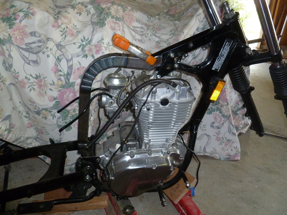 I bent and spliced in a a piece of 1-1/2 square steel for a backbone with heavy gusseting on both ends, picking up the cut-off ends of the frame tubes and the swing-arm pivot tube. This allows the carb to stay where it belongs and I found a good rubber "Cobra" right angle elbow to turn the intake to the side for the air filter. Here's the link;