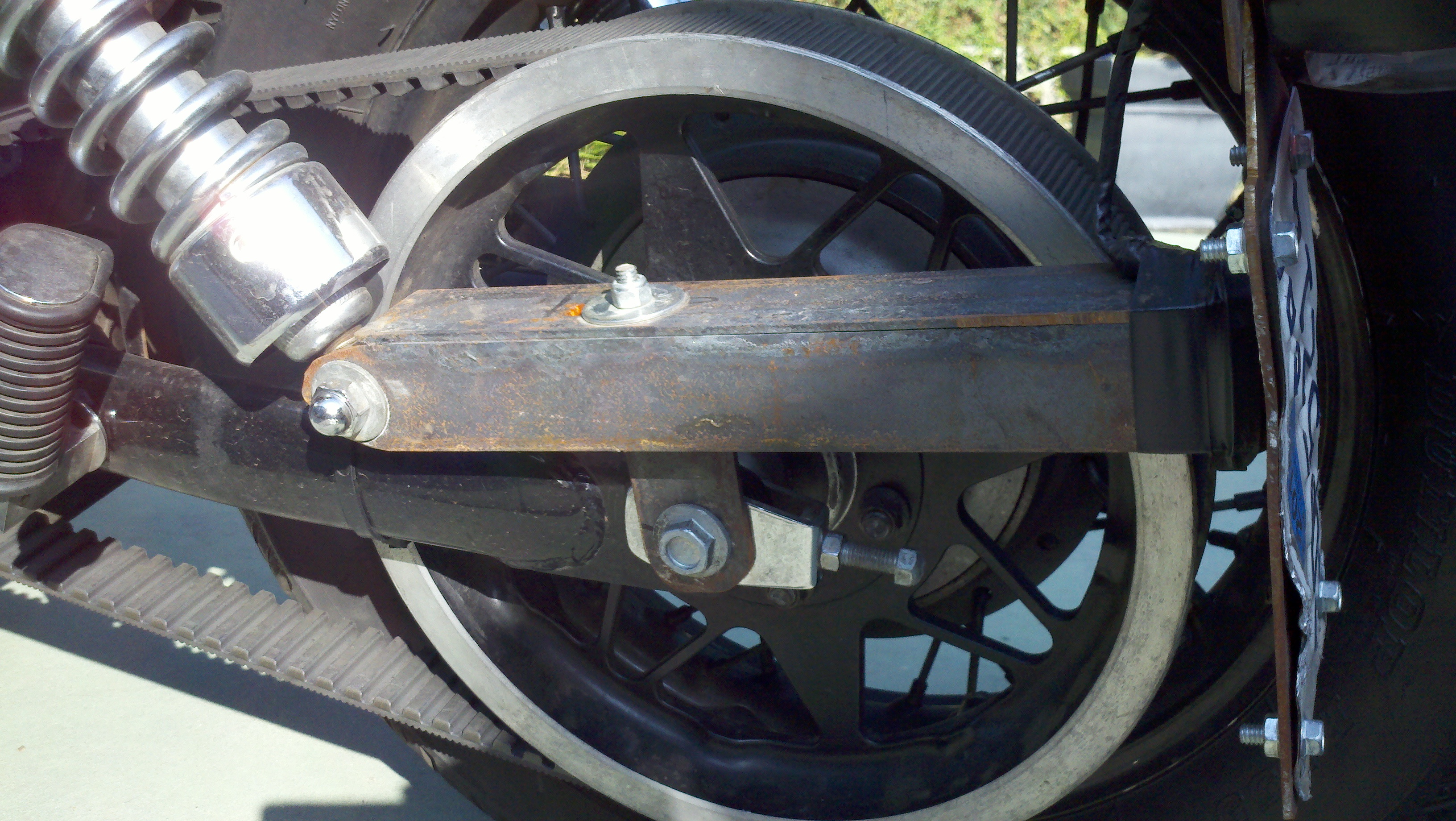 So my buddy and I rigged this up until I get a longer fender, longer axle bolt, and longet shock bolts to mount a sissy bar assembly to which the license plate assembly will be a permanent part of.