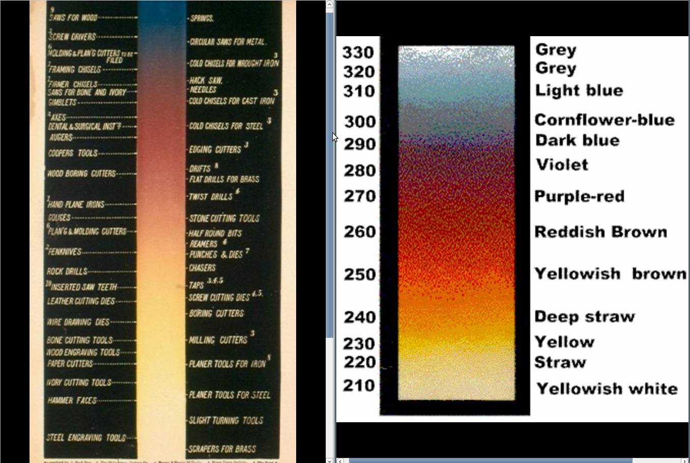the iridescent color that appears on the smooth surface of hot steel as a result of the formation of a very thin oxide film. The thickness of the film depends on the reheating temperature; films of different thickness reflect light rays in different ways, which accounts for the different temper colors. Typical temper colors for carbon steel are straw (220°C/428°F), brown (240°C/464°F), purple (260°C/500°F), dark blue (300°C/572°F), and light gray (340°/644°F). The same temper colors appear on alloy (especially highalloy) steels at higher temperatures. The colors are also affected by the holding time of the steel at a given temperature, the illumination, and other factors. Before the advent of pyrometers and suitable testing and measuring instruments, the temperature of reheating was judged according to the temper color.
