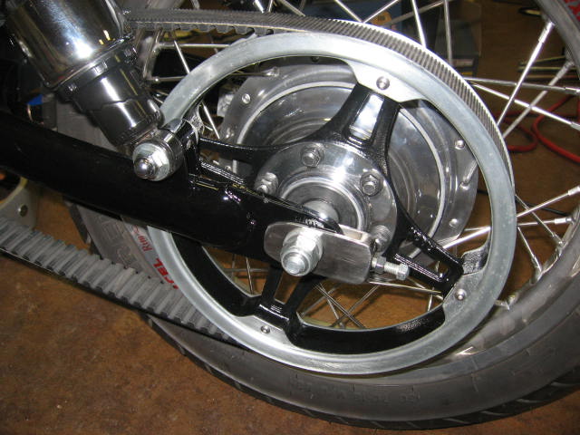There is just barely enough belt adjustment to make this work.  On my Cafe' conversion I have about 1/2 turn left on the adjusters before I bottom out the axle in the swinge arm.  This winter I plan on extending the swing arm table 1/4" and will make the slots a bit longer....while filling up some of the front of the slot.  On a stock bike with normal length shocks it might provide a bit more adjustment room.