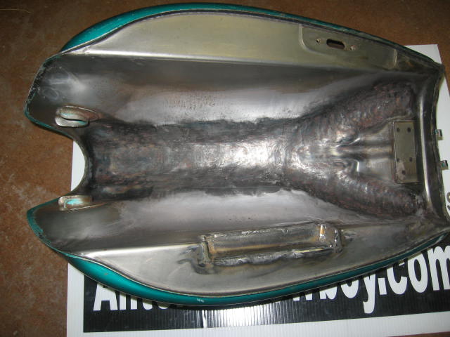 The width of the square top frame and the decompression solenoid also require a pretty wide tank tunnel. This is what I had to do to make a GT550 tank fit low.