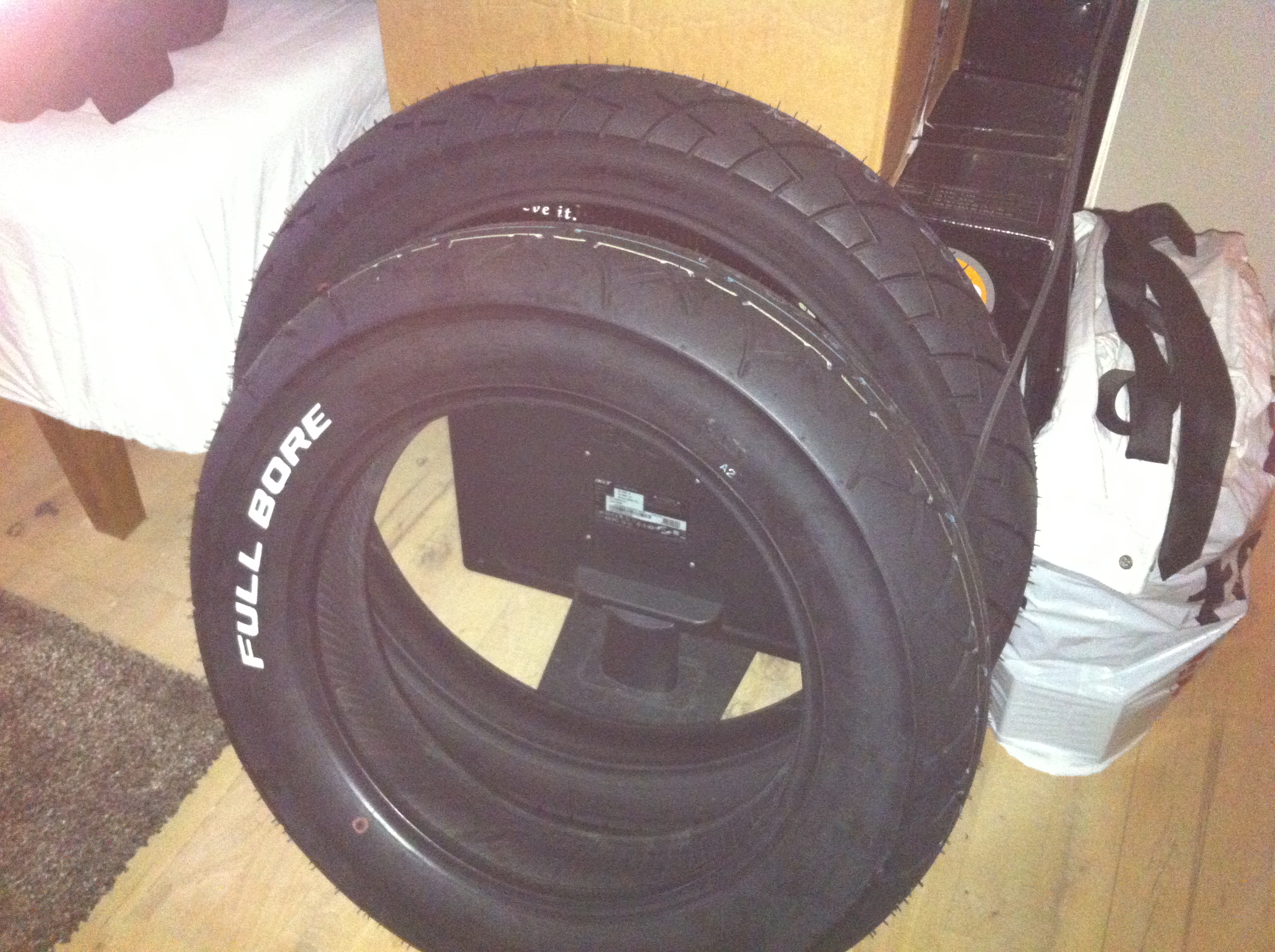 This evening I got the rear tyre mounted and balanced.. That was a harsh one for sure, but I managed with a little help.. If you haven't already noticed, the tyres I've bought is someone called "full bore usa". They should be really good tyres and the price is only half of what metzeler marathon costs, and the pattern is actually quite similar.. The front is standard size, and the rear is 140/90-15..
