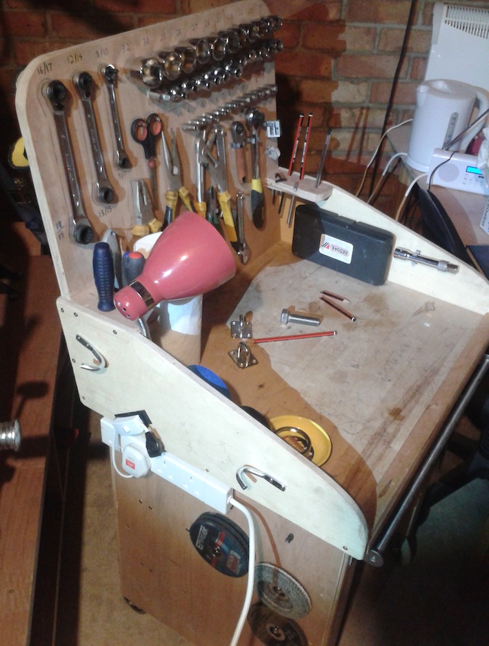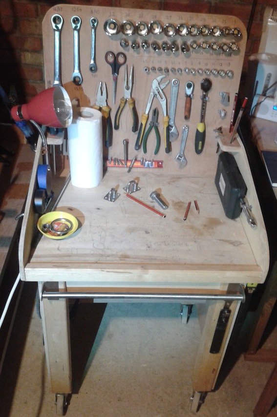 Tool caddy (sorry but I'm calling it a wrench station!) is an Ikea butcher's block that I kind of hacked around with and got to where I wanted it. put an angled back on it and some sides and some dowels for the sockets and it works pretty well so far.