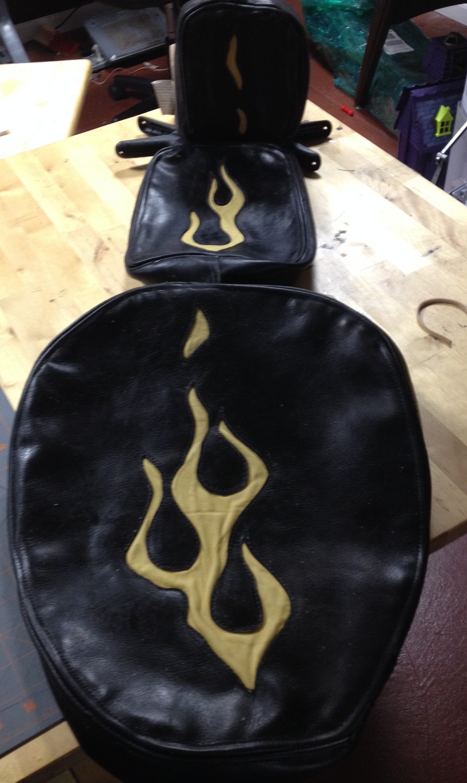 I used a really nice soft cow hide that shows the grain and dyed it black. Then for the flames, used yellow deer.