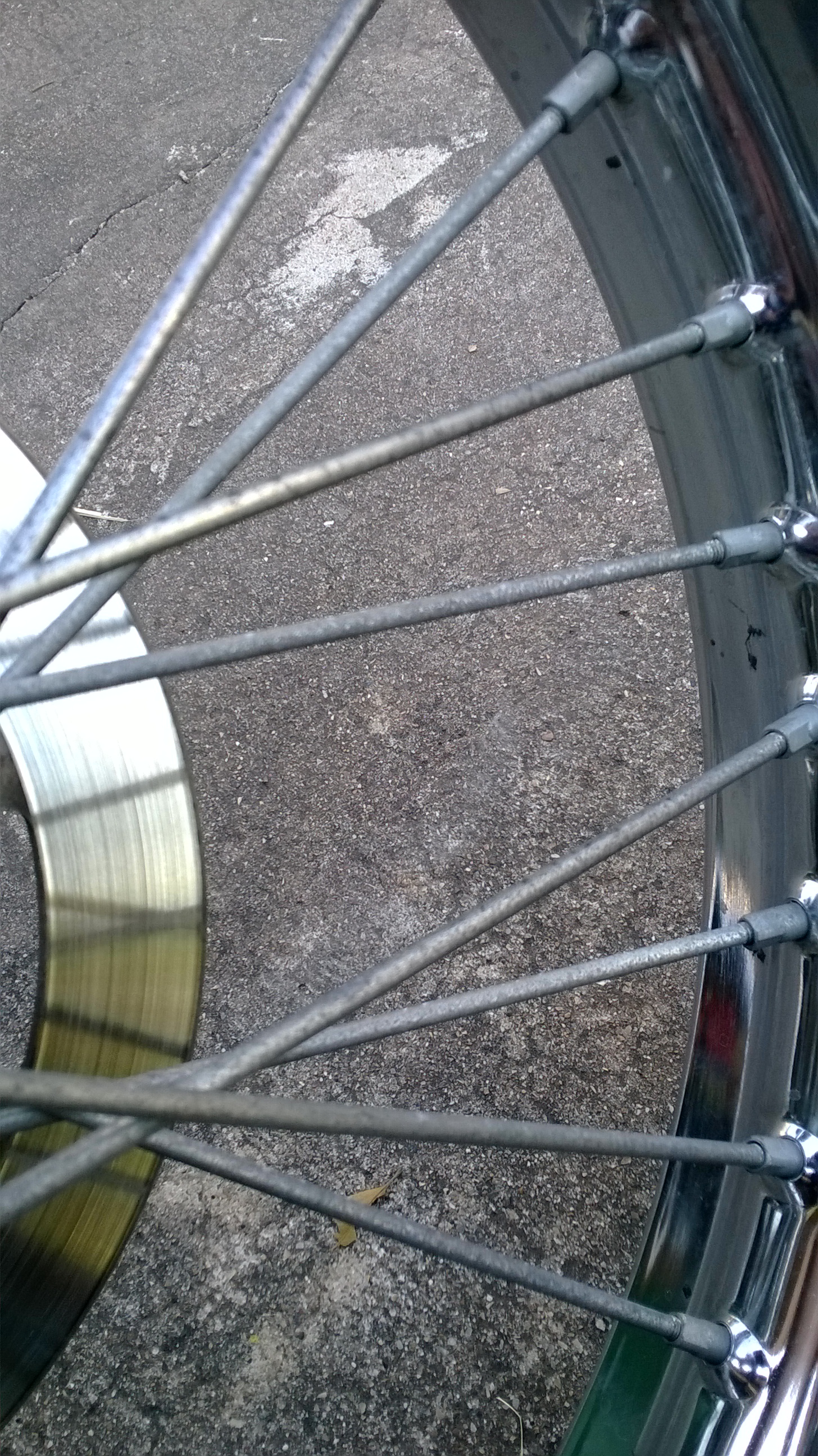 If you go to Harbor Freights or most any hardware store you can buy these flexable foam sanding pads in different grit. Buy a fine one. It will wrap around the spoke and just wipe up and down and they will look like new. A little bit more work and they almost look like chrome. Might take a half hour to a hour to do the all of the  front spokes but looks great when finished.
