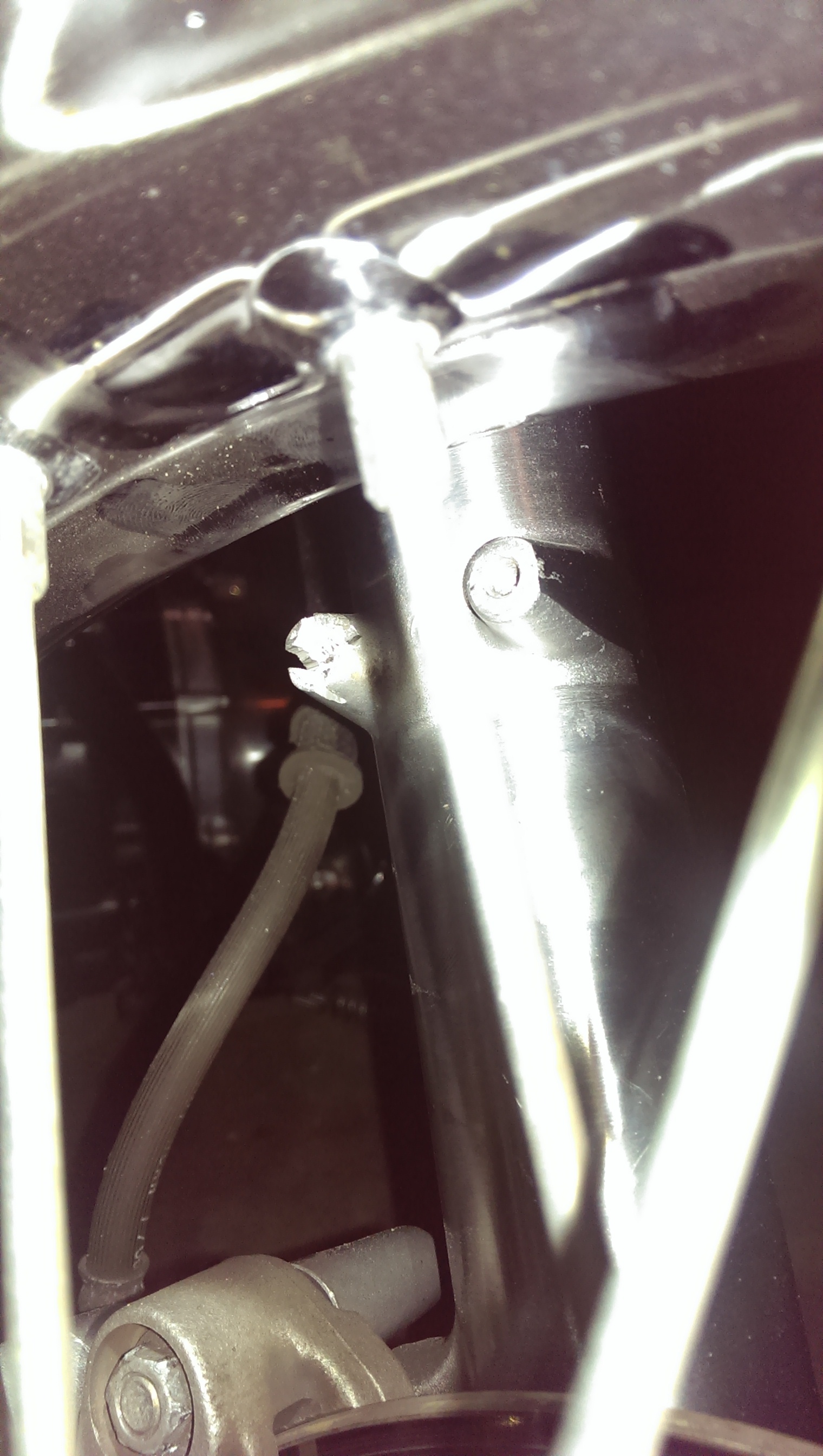 So after I did my fork lowering, I went to put my front fender on and the last screw I put in somehow busted off and was stuck in the fork. I tired using a screw extractor today, I had the hole drilled through and I put the extractor in and hammered it in good, and I went for one more but with the hammer and if busted off in the same spot, and now this metal is even harder then the forks. I spent 2 hours with a drill and nothing... I actually went to a specialty store and got still bits meant for going through hard metal and nothing. So I don't know what to do. I'm not going to run a front fender with just three screws, and I tried everything, I even drimmeled into the fork trying to get it out with a flat head. Am I going to have to go to some shop just to have a bolt removed or rather a bolt extractor removed now, or would it be better to have it drilled to a larger diameter and rethreaded? Please help! As you can see from the picture, I made a mess of things, but I plan on painting my lower forks so I figure I can put some sort of filler in and paint over it...