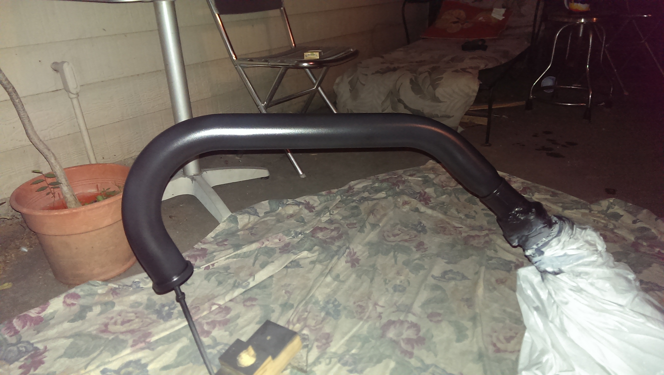 So,  that long explanation leads me to the main purpose of this thread.   How can I cure this without firstly burning off paint as my only main option is to do it on the bike.   But before I even do that,  is there some way for me to maybe cure the end of the header so once it's smashed in there the paint doesn't just get crushed right off?   I've read of using a heat gun but I have one and I put out to the painted area I had to sand down earlier and it just made it revert back to a liquid almost.   A more logical,  but precisely executed thing I could do which I've read works is to take a blow torch at one end and let it cure that way.   Now I imagine this would not be a flame to the paint approach,  but rather taking the torch and have the header pointed directly up so the head applied goes through it like normal,  and from some distance hold the torch upwards towards the header until the desired temperature is reached,  or just doing that off and on slowly heating it then letting it cool etc...   I'm just not very sure of how I'm supposed to make this work without at the very least compromising that portion of the header where it connects to the bike.   Granted,  no one will see it,  but I am anal about things being perfect and I've seen others do it on YouTube without this problem and I will be getting those and results darnit!   Lol,  ok,  so others on this forum have mentioned that for the rest of the curing process to just take it crazy slow,  like ten seconds on at first and then cool five minutes,  and slowly work up from there.   It can't really be that tedious can it?   If so,  VHT is going to get an ear full from me on the misrepresentation of how to apply their product.    I'm already pissed I have to buy another can of black just for our what,  1.5-2 foot header?   Granted I'm doing it a second time,  but if they'd give more details about ways to cure then this wouldn't be a problem....   So please any help as to how I can make this look the way it does before I cure,  after I cure?  Also any suggestions on my previous question about how I plan to finish the painting process would be much appreciated!