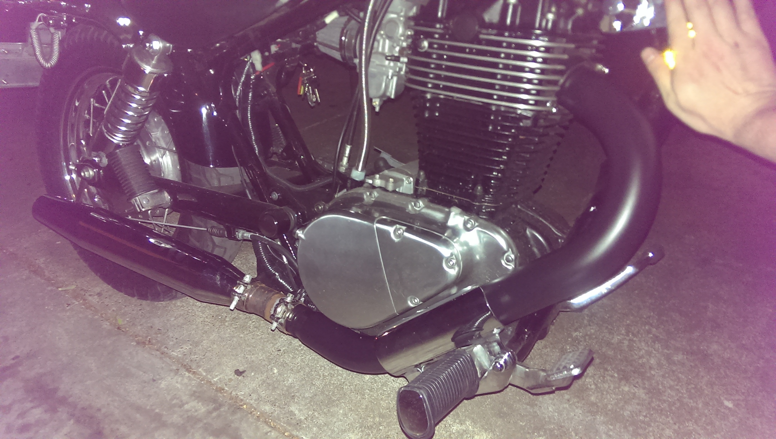 So after many days of letting my paint dry and going over the outside with my heat gun for about 30-45 minutes 4 times I've finally got my exhaust back on the bike.   I'm currently waiting for it to cool,  I've gotten up to about 5 minutes of running,  starting with 30 seconds and then add a minute after every 20 minutes of cooling,  along with using my heat gun for the outside as its running and so far so good...   I don't want to jinx myself but it looks like it's going to finally take.   No bubbling,  chipping,  or cracking and it's gotten hot enough that the smoke has started.   While I was waiting for my paint to dry I contacted VHT about what happened and they offered me a refund.   I don't know if I'm going to take it I guess I'll just have to see how this turns out,  but if I had the option of just getting this done professionally at Polydyn here in Houston I'd of just done that.   Would have been $70 and that includes stripping the chrome so the fact I've spent about $50 -  $60 just for a DIY paint job is rather upsetting.   Even if it does stay,  and it does look great,  I can see areas where it's not 100% smooth and being as anal as I am that kinda stuff gets under my skin...   OK well here is a pic of what it's looking like now,  I'll post another when I finish curing.   I will probably end up taking it off and try to smooth out as much as I can after this,  but for now I'm pretty happy with my work.
