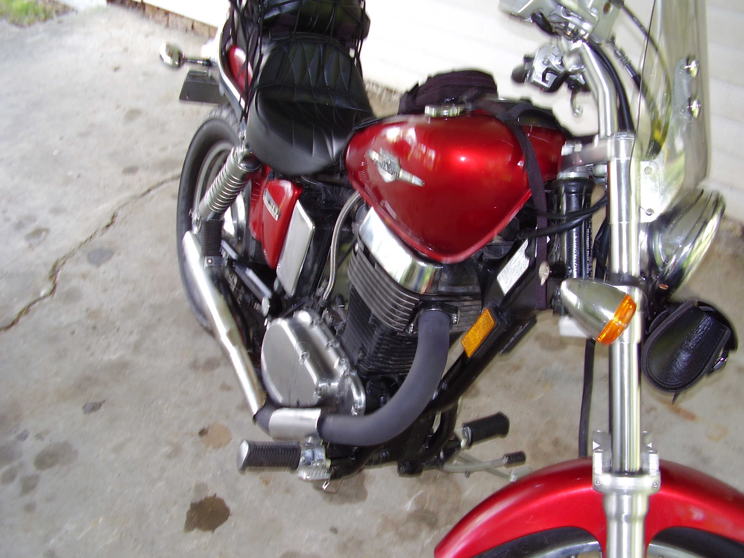 2001 Black, Spitfire windshield, Headlight upgrade, Sissy rack, Tool bag, Fork bag, Harley muffler, Memory foam seat, Crash bars. Hwy pegs, Raptor.