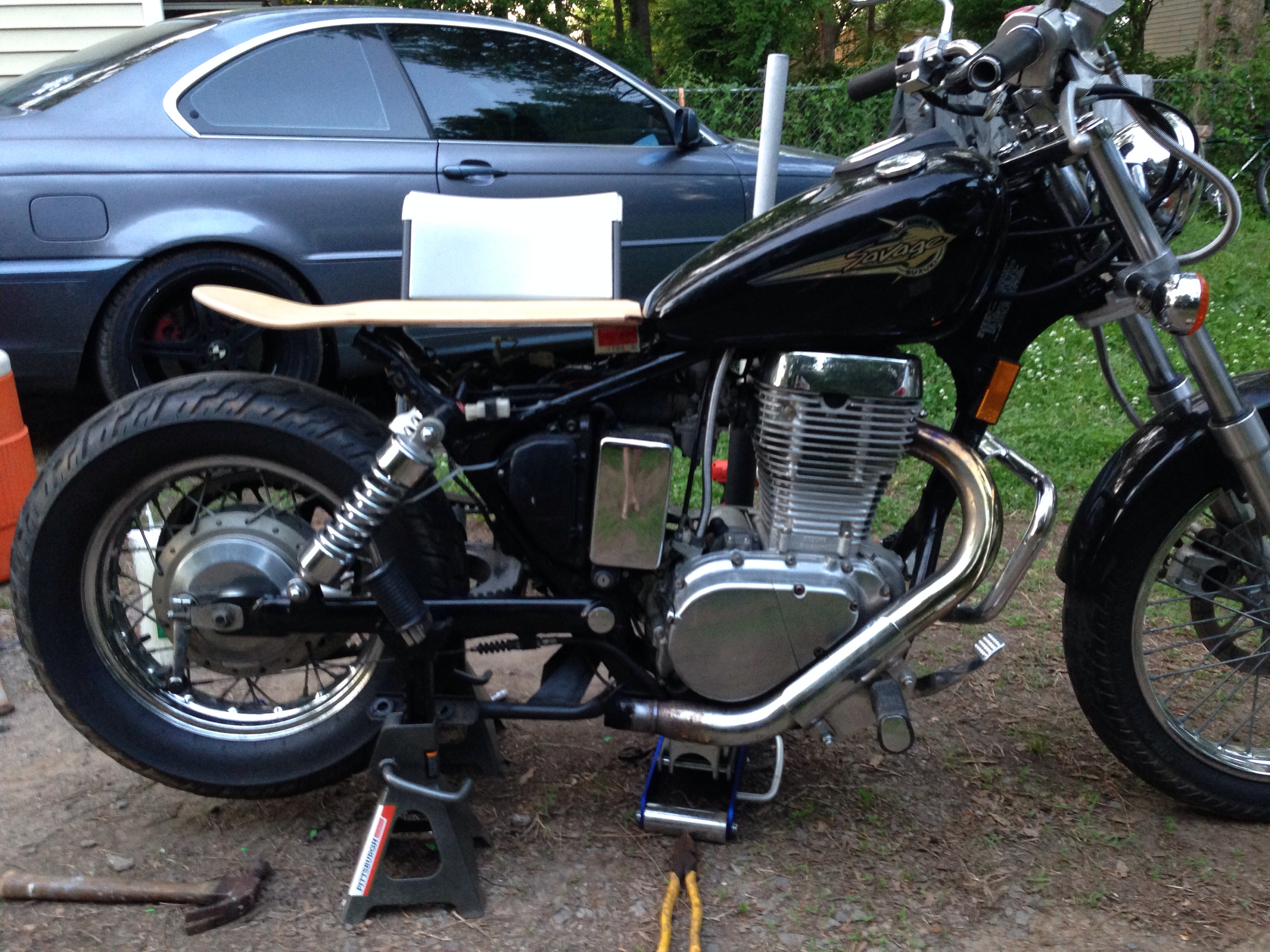 Seat is available. Good steel pan, good foam, needs a cover. 1963 Honda 248cc race bike that gave up the ghost and went to a new home. You'll need to fab a different mounting system for a proper tracker look on a Savage, the factory frame is "goofy". See the Ryca bikes for frame trimming-filling-plating ideas.