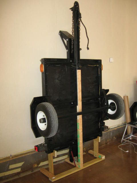 Here is a photo of how I stored the little 40x48 open trailer.  I made a little stand that held it up against the wall.  This trailer was 20 years old, it was very similar to the little 40x48 trailers that Harbor Freight sells, and it had a single metal ramp.  I hauled the Savage on it a couple of times and it did great.  The only issue was the short ramp and I had to back up against a small hill to load so the bottom of the Savage did not drag on the ramp when loading.  I think my ramp was only about 3 feet long.