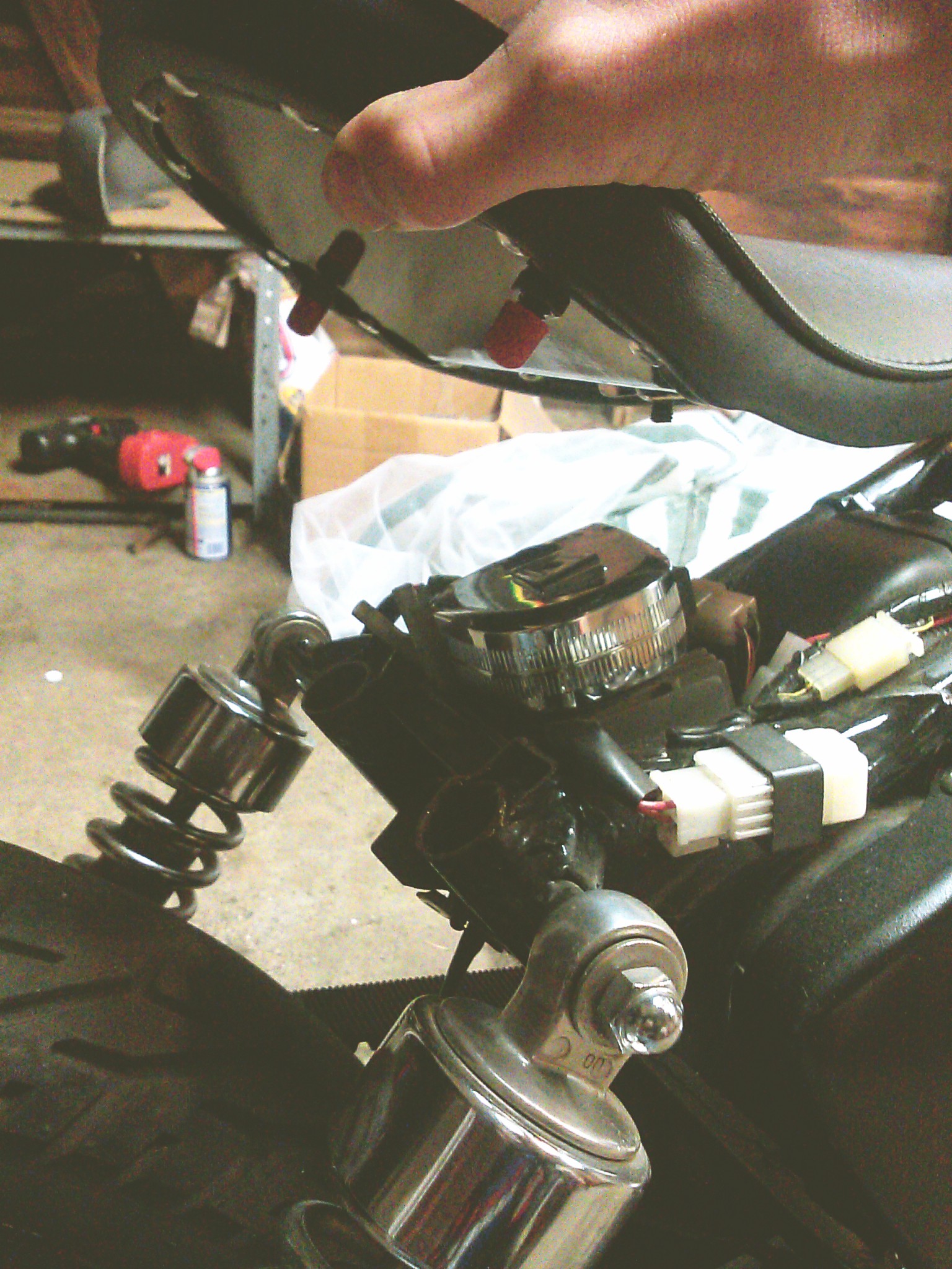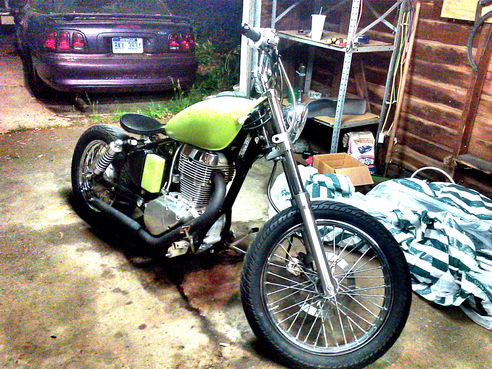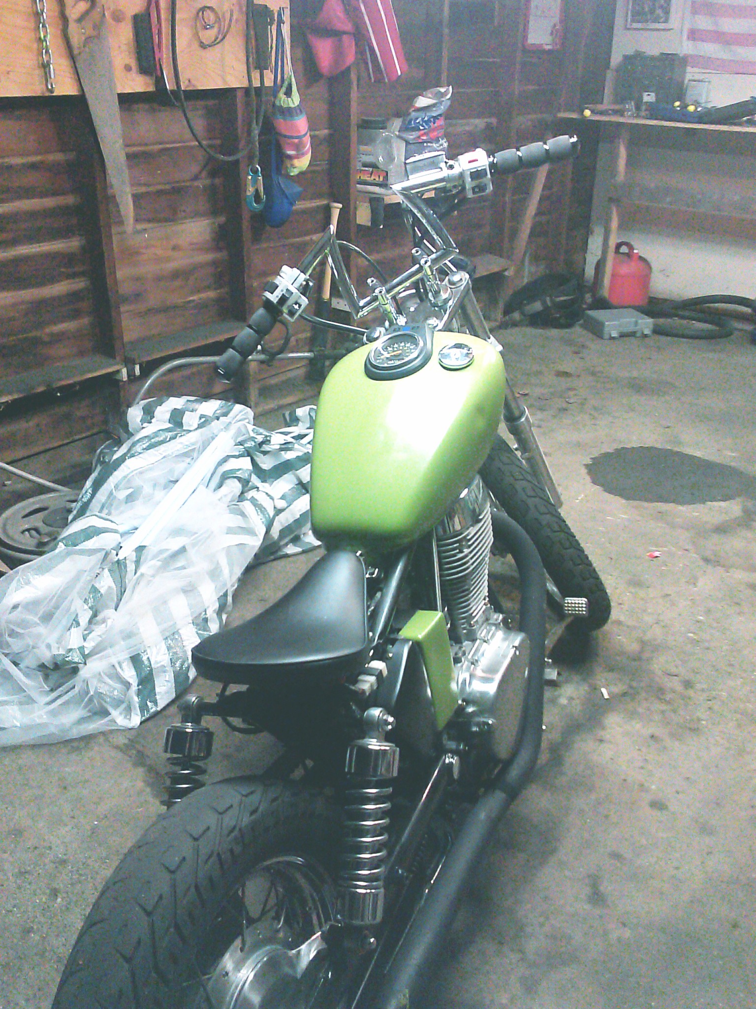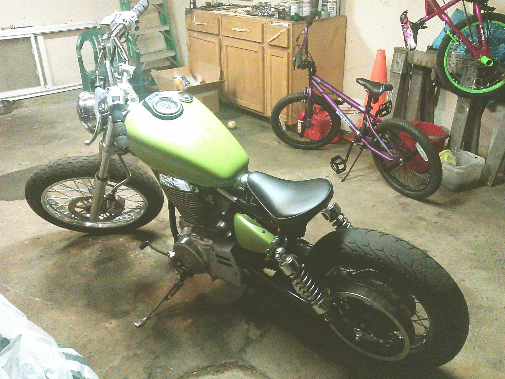 My bobber transformation in progress still have to get the exhaust done running just a 2inch pipe with a straight pipe baffle off eBay. Also I used sockets for the risers the bars are keystone bitwell probably painting it all black and the seat I just have to come up with a way to mount the seats rear Springs any suggestions? Need Pegs also and gonna bore it out to a 750 Smiley