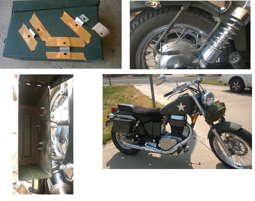 I made the brackets out of a baking pan. The metal was thick enough to hold and thin enough to bend around the bracket to get the right shape. (If you use the fuel line cushion be sure you wrap the metal to shape around the fuel line, not just the saddle bag bracket alone.) I held the ammo can up to the bracket and outlined the location with a magic marker then drilled out the holes. Put the bolts into the brackets then hold the ammo can up and push the bolt through the ammo can wall, put a self locking nut on it and tighten down. Took about a half hour.