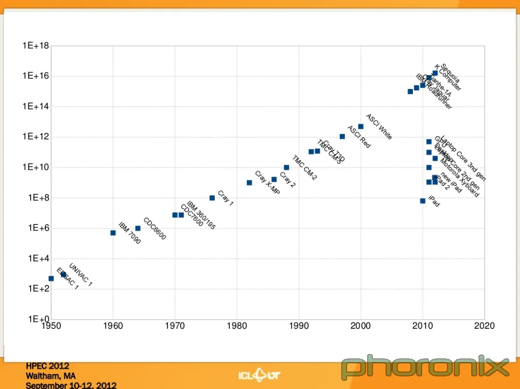 "When benchmarking the Apple iPad 2, the University of Tennessee employee achieved 4 GFLOPS per Watt on the ARM SoC (measured at the chip level). As the below chart shows, he found the iPad 2 to be as fast as the Cray 2 super-computer from the 1980s. The Cray-2 was originally the fastest super-computer in the world when it originally premiered. Piotr Luszczek also found that the original iPad was about the speed of the original Cray-1 super-computer. The latest iPad meanwhile is just a small performance bump over the iPad 2."