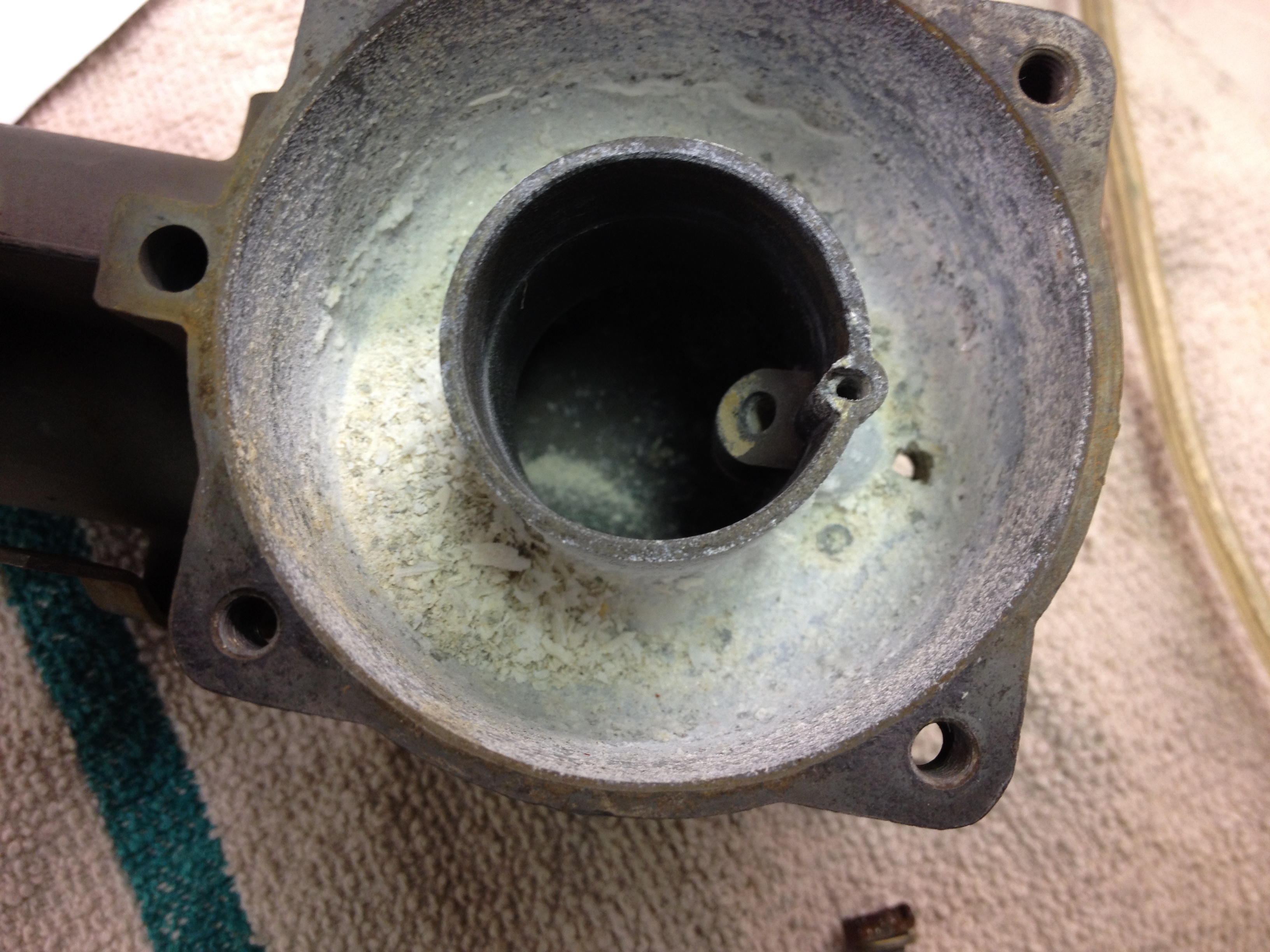 Here is the float bowl from an old Craftsman lawn tractor a neighbor brought me last week.  Typical ethanol fuel corrosion to aluminum - white powdery corrosion with no trace of any varnish or gum.