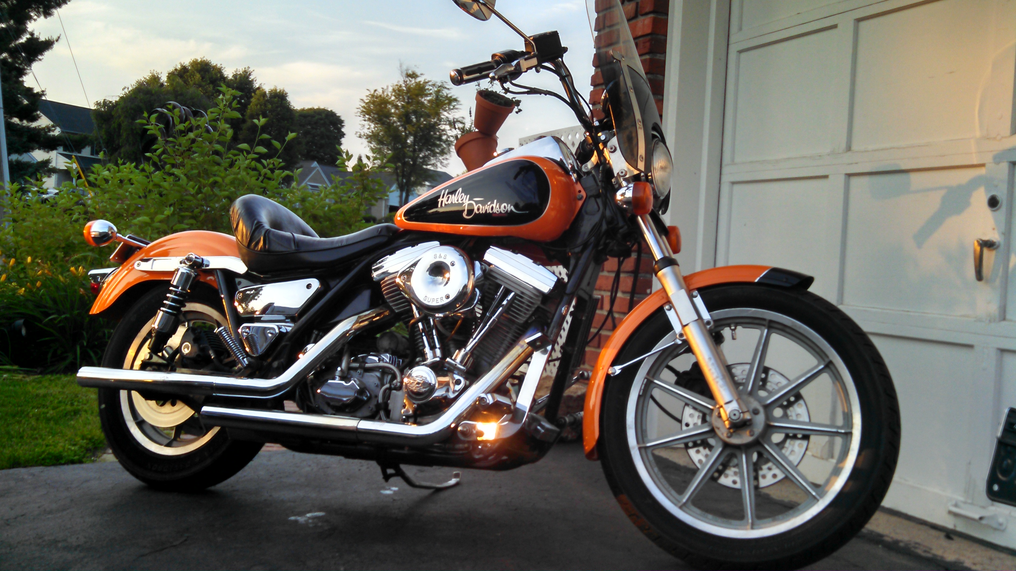 I picked up another bike this week, a 1986 Harley-Davidson FXRS - one of the few HDs I would consider owning.  I got it from an older guy who was disabled and couldn't ride any longer, but rather than sell it as it sat in his garage, he had it fully serviced - new tires, battery, braided lines, gas tank (old one got rusty inside), fresh paint, new oil cooler.  The thing runs and rides excellent, and has everything I'd want - Vance & Hines pipes, S&S Super E carb, Progressive shocks, forward controls (never was a fan, but fits me nice on this bike), and a nice easily removable windshield (already removed it!).  Got it for a song!