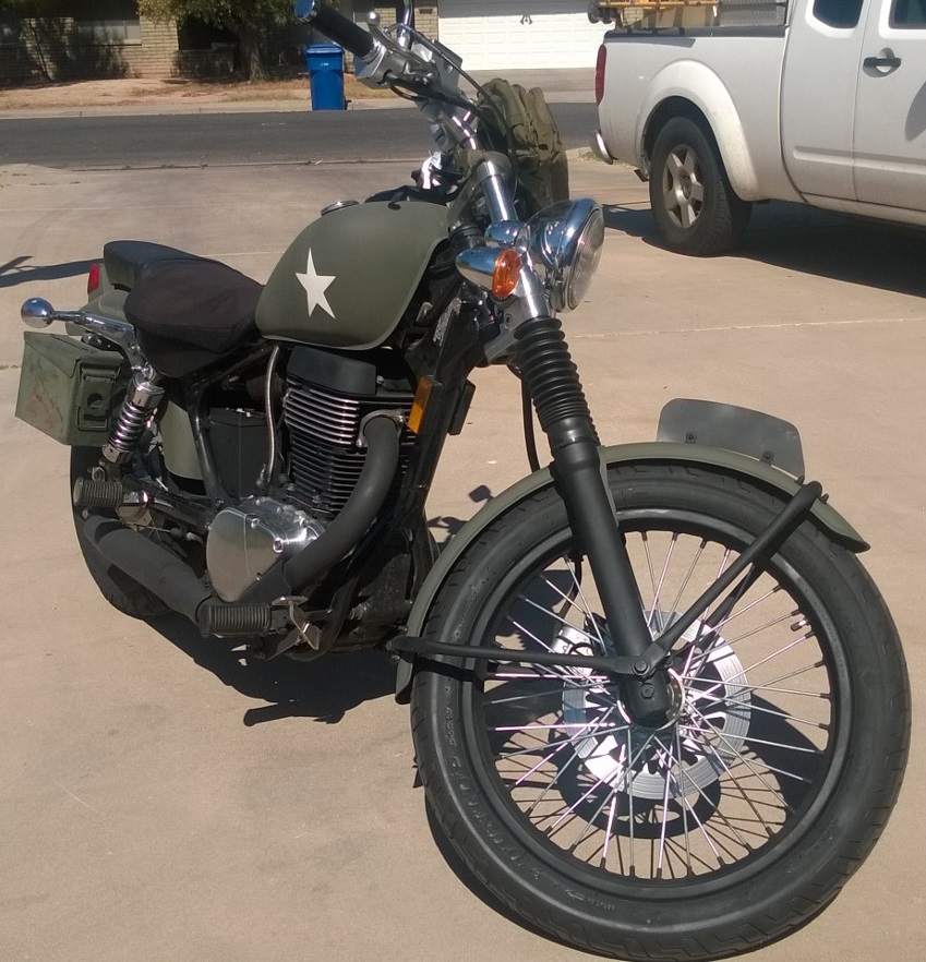 OHHHH!!! THAT is a cool idea! I may be spending the weekend painting!  OR riding... I'll try to post more pictures. I'm working on re-arranging the battery. I just bought a stock size battery so I don't want to do anything permanent until it dies and I get a smaller one. I figured out how to brace it in where the old air box was for now. I'm also trying to think of something cool to put on the front fender license plate.