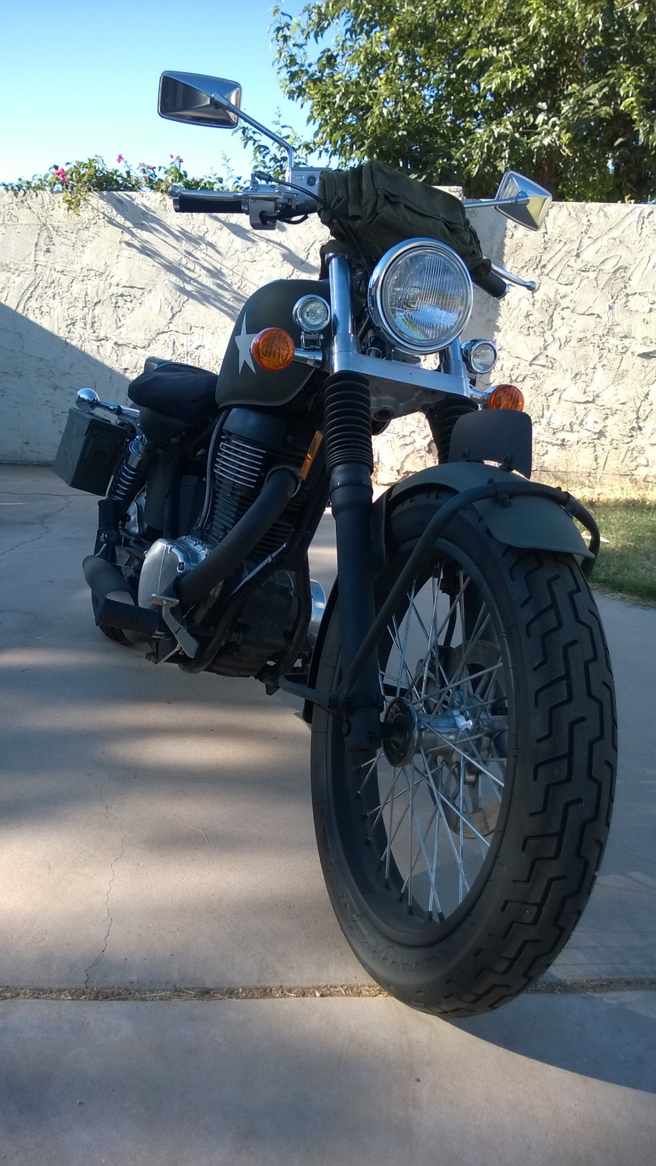 Fork gaiters, blacked out rims and Dyna, 3 headlights, '73 Water Buffalo fender retro-fit (it's a pain), ammo can bags. vintage European front fender plate.