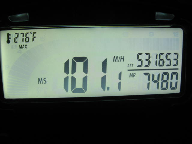 One cool calm nght I was on a secton of road that lended a somwhat safe envorinment for a speed run.  Long straight stretch without any intersections or driveways on either side.  I held the throttle open until it appeared to stop climbing.  The bike got to 85 fast, 95 came much slower........101.1 felt like tall I was going to get.  Next year I am going to build a 1.5" header.....that may help a bit.