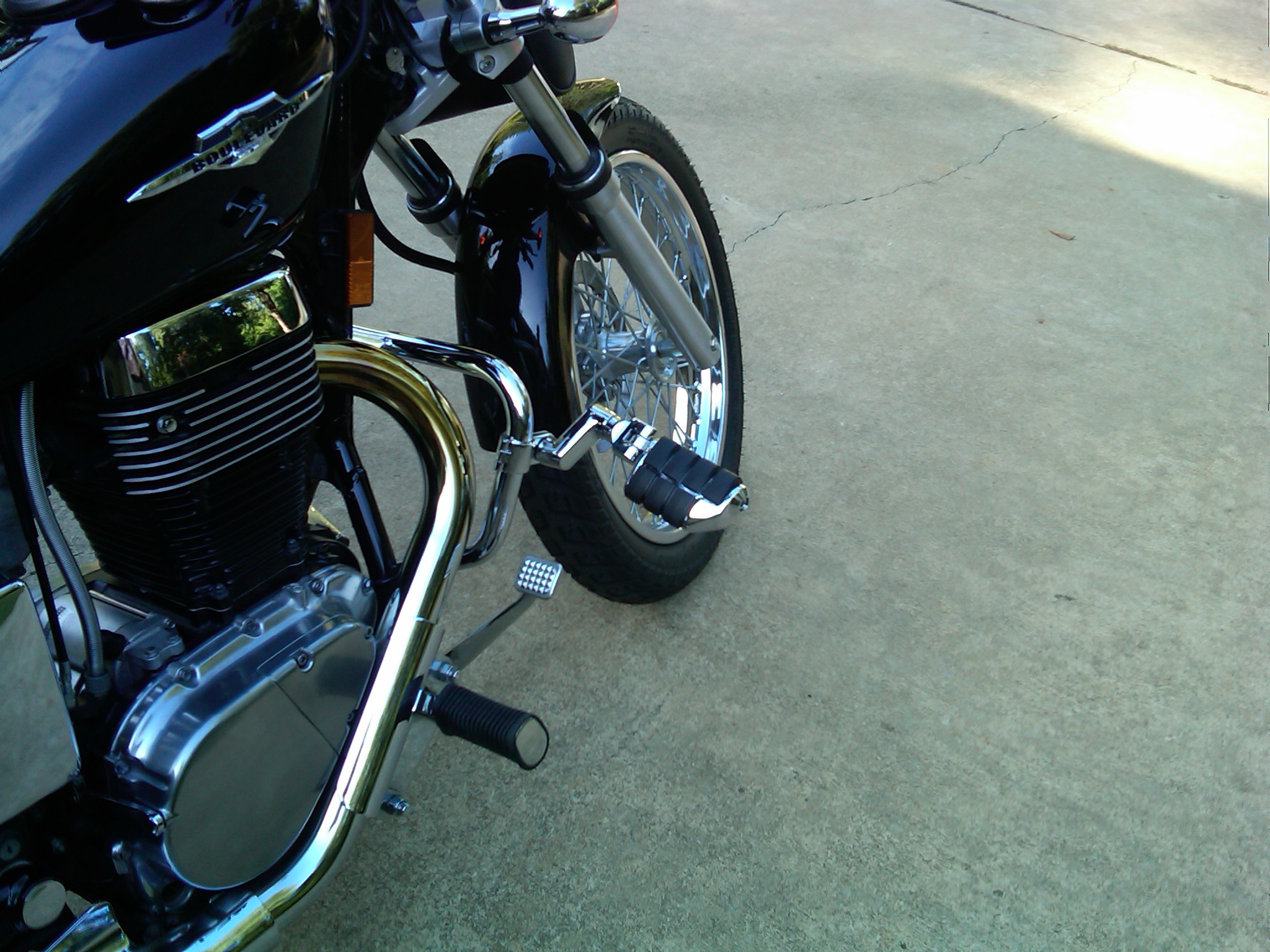 I had the same pegs and the same problems. Got some Longhorn Offset Highway Pegs and never looked back. The offset is key, to me, for a comfortable ride. The ones you have, and that I had, had me feeling like my knees were in my chest, and I'm not tall, even for a girl. I feel like, with the new ones, I don't even need forward controls to be happy.