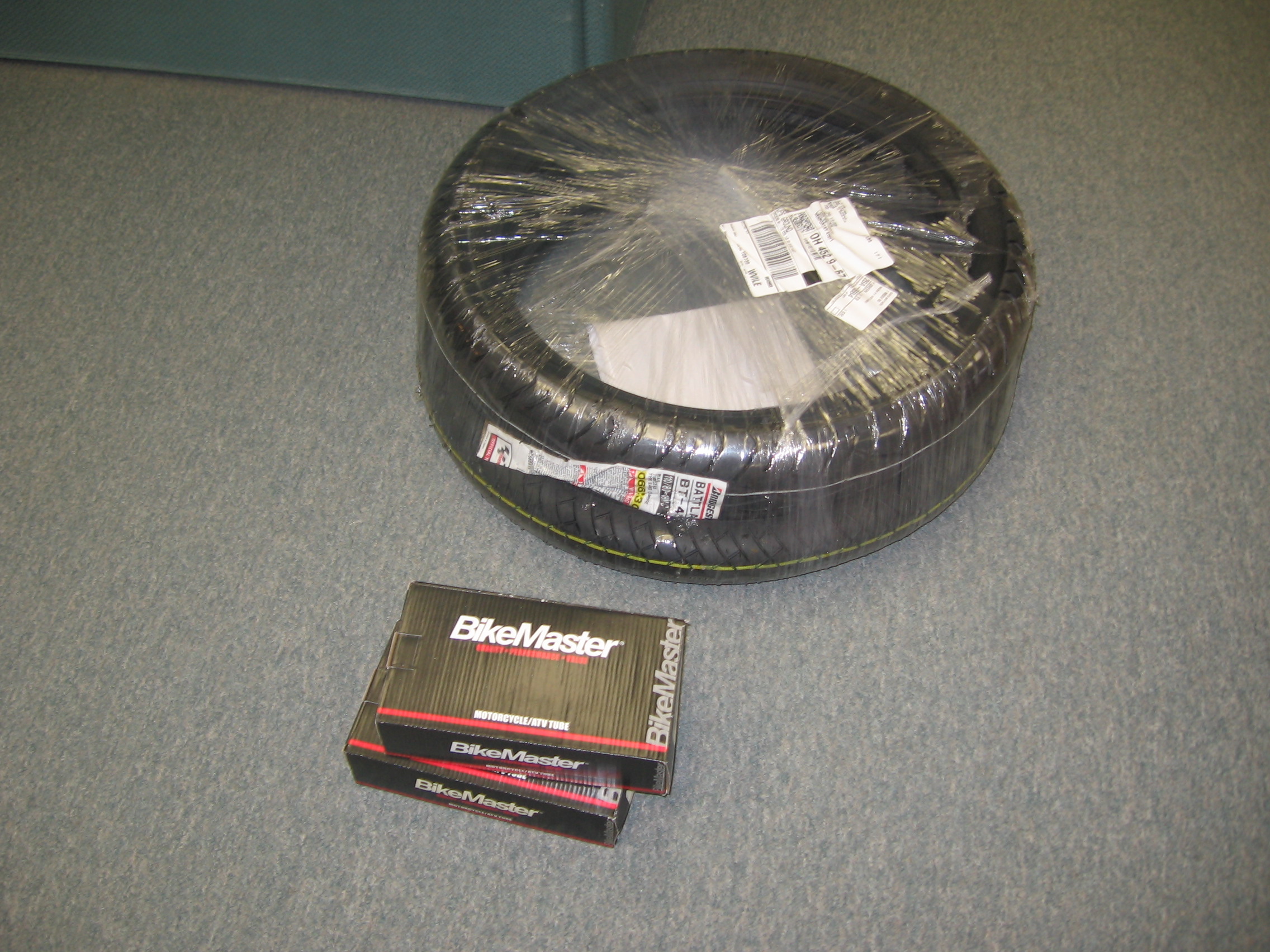 Well....It seems I have some work to do.  My new 90/90-18 front and 110/80-18 rear tires and tubes came in the mail today.