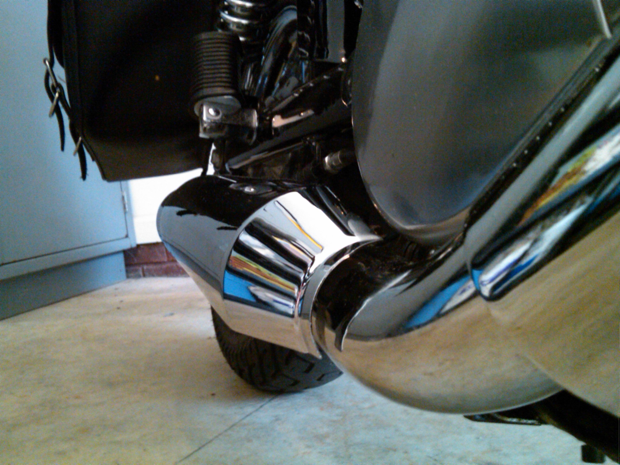 The problem with the front of the shield, is that the Savage header outer pipe has a 2" diameter....while the original header used on the Harley is 1-3/4" ID pipe.  Harley has nice chrome shields that hide the smaller pipe behind it.  The shield on your muffler used to have a larger shield on the header pipe that connected to the muffler...and a smaller header pipe hidden behind it.  (Next time you see a Harley.....go look at the shield set up).