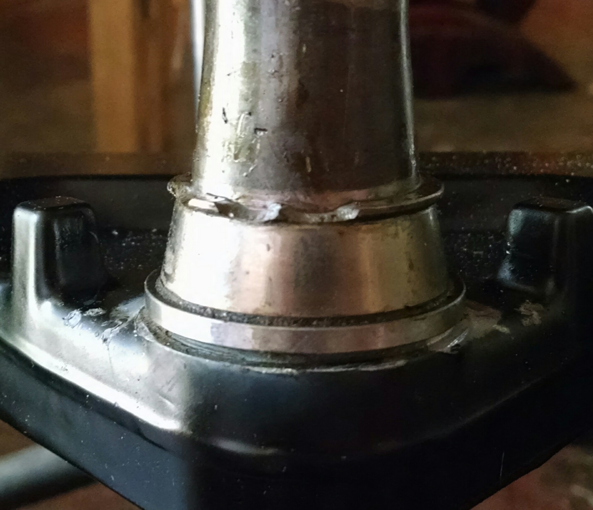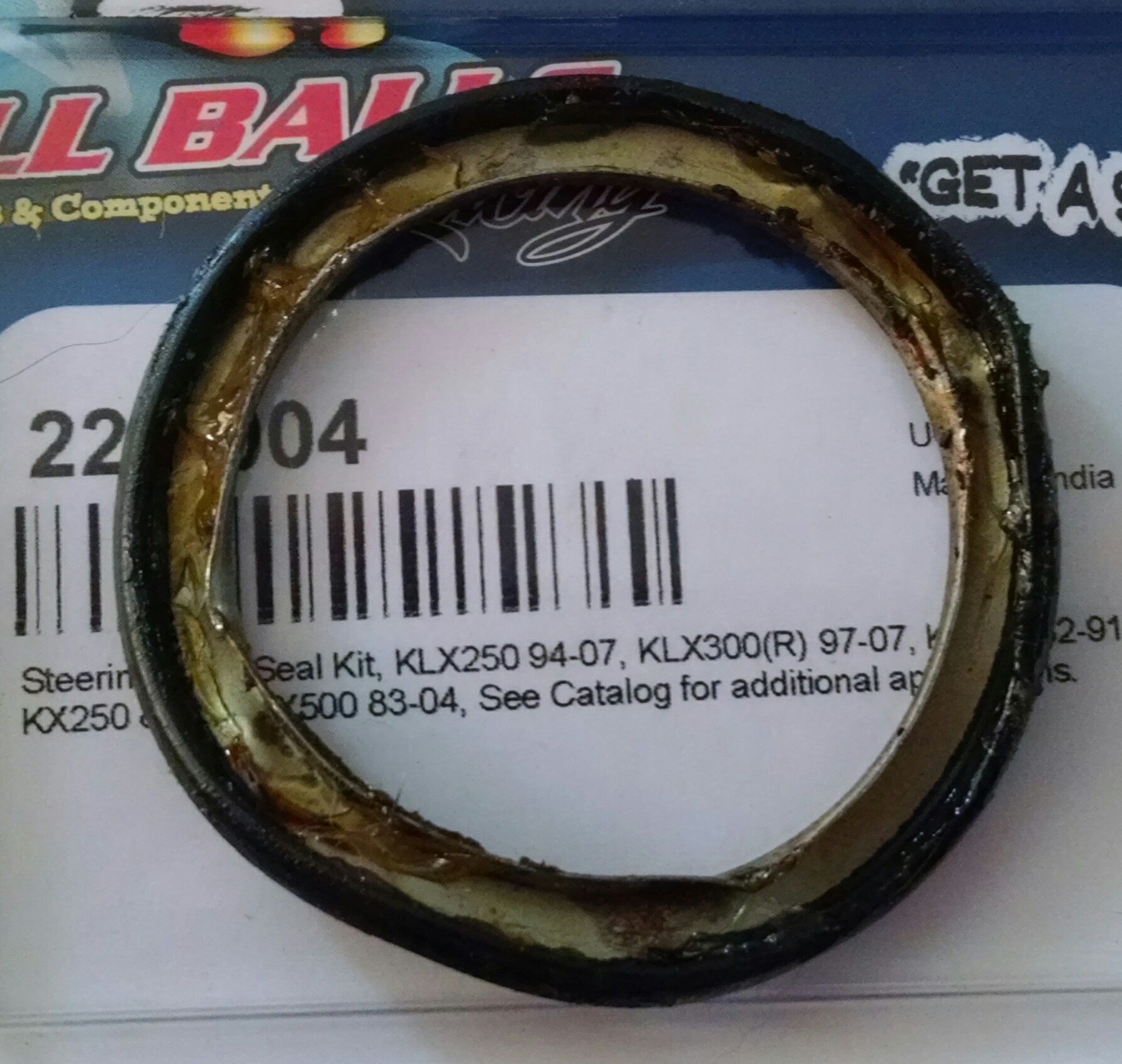 Picture: Ok so this is after i smacked the heck outta it and broke some pieces off. I got it to move a little bit hence the gap. but there was no seal occupying that gap, it was just the bottom piece of the bearing against whatever that thing is that holds the steering stem and all its nonsense.