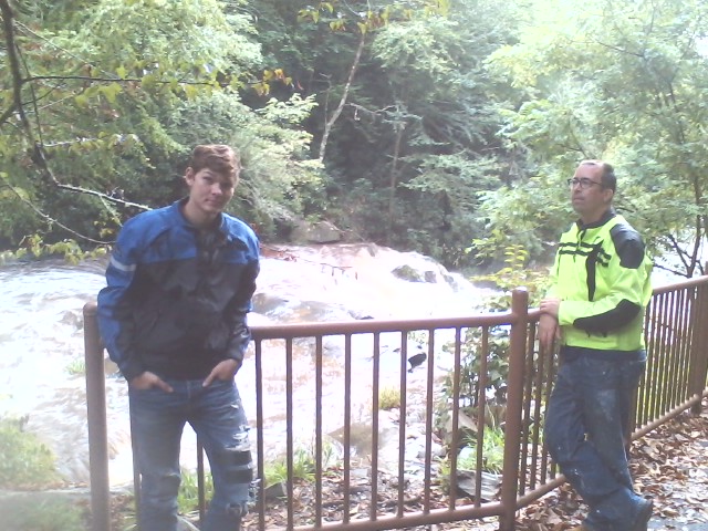 Thinking of "Wrecks" , that guy from the Louisiana/NY (Adam) was following Dave on the Dragon with me behind him and was doing OK kinda so Dave went on with his normal pace and disappeared around the next corner.   I watched him for a couple more turns and though he was doing just fine , so I went on around him and was keeping him in my mirror hopping he would would pick up on my lines .   It was frustrating to hold-back that much but things were going along just fine till I need to pay attention and set up the next "inside-the-cove-horseshoe-left-hand bend 160deg curve with a right-hand 120deg right behind it.   For the folks with a map it was ("SHAW GRAVE GAP AND MUD CORNER) mile 6.4 and 6.5  .   I got up to GUARD RAIL CLIFF (Mile 7) the road quit twisting so much and I noticed Adam wasn't in the mirror no more  Huh .   So , ---- , I went back to see .  Sure enough a couple of sport-bike guys were helping him up out of the ditch at SHAW GRAVES GAP.  I stopped too and he had one little red spot on his left knee.   It took him a long time to get the 1.5 miles up to the overlook after that , and his bike was fine.  Only the footrest gouge in the dirt and the red spot on the knee remained .   That SV650 he was ridding was almost to tall to be an effect cornering tool the was I see it,  but I couldn't help but wonder "what if it was lowered just a little ??" Huh