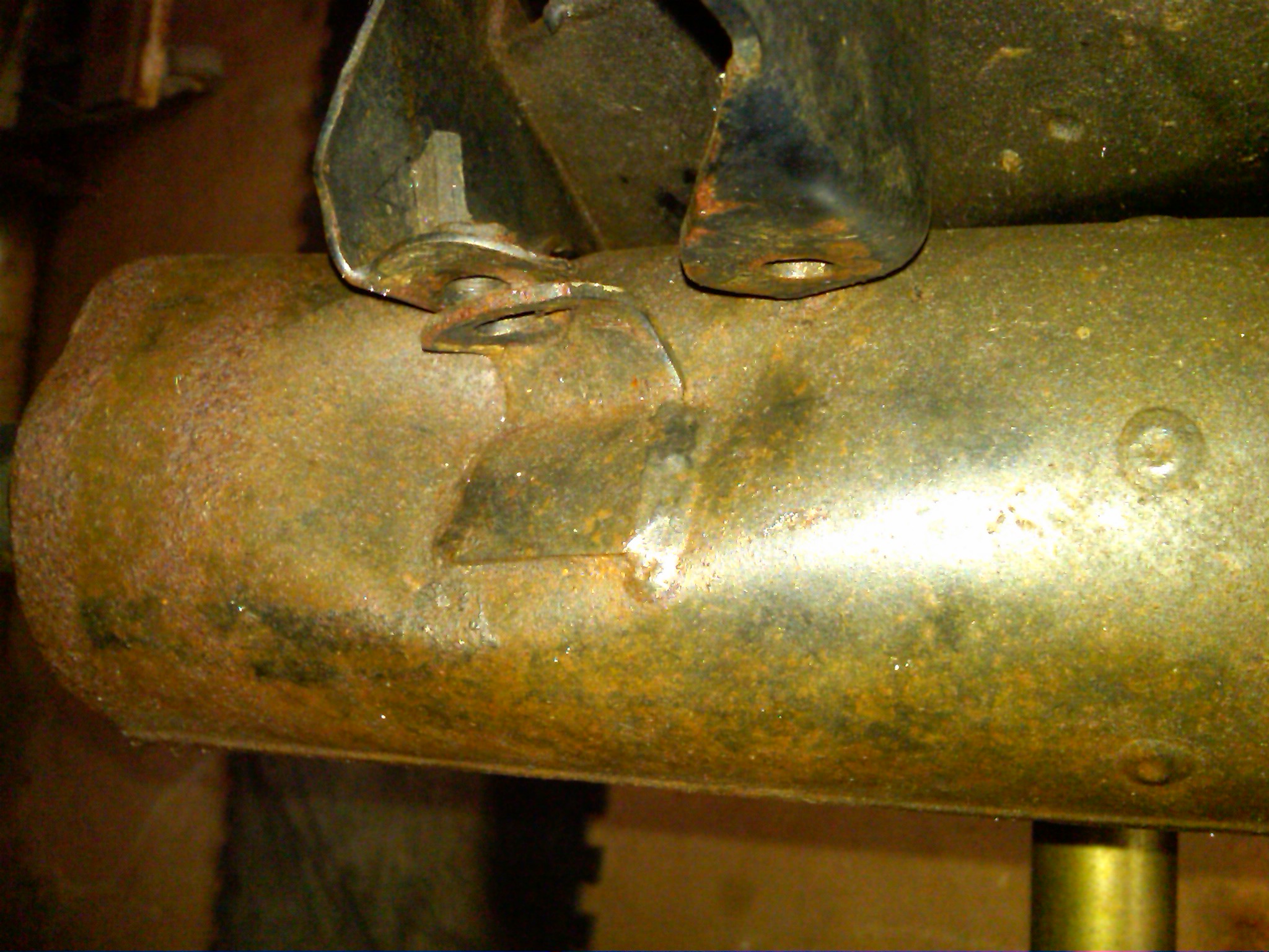 Remember, UN bending needs to happen slowly. Big Smacks arent the snswer, and yes, that bracket is what bent it IN, and that is what will bring it out, Id try to work it cold before I used any heat. You need a friend and a vise and like a 1X3 piece of wood to lay on the metal, work from the outside edges of where its bent, Someone holding the end of the muffler and the already somewhat straightened bracket secured. You will probably need a metal strap to bolt to, to get room between the muffler and vise. If it will replace for under $50.00, it looks old now, you mite be ahead to slap one on and call it good.
