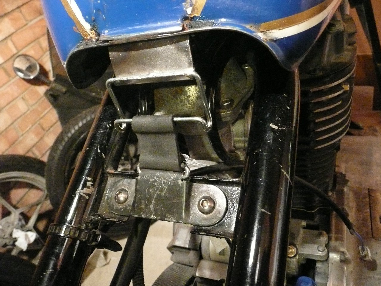 Following in others footsteps (Dave's) with slight variations, used the old tank mounting points and the old seat mount to create a holder for the GT tank hook. Works great: