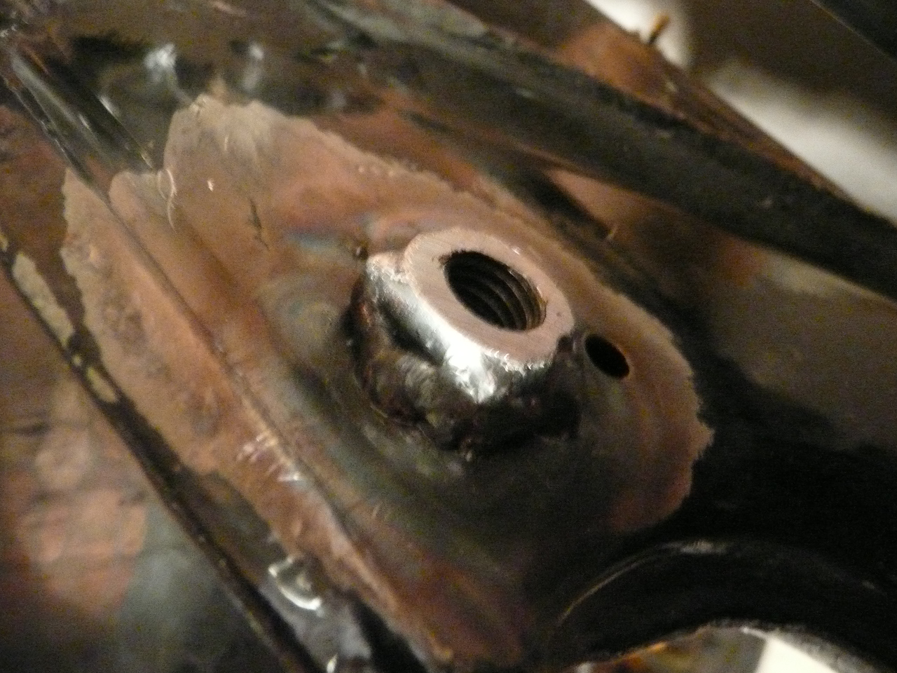 Support for rear subframe done. Nuts are welded on the underside so I can bolt the subframe on and off for a while while I sort out mounting brackets for mudguard etc. Much easier to weld on the bench than in situ with my level of skills methinking.