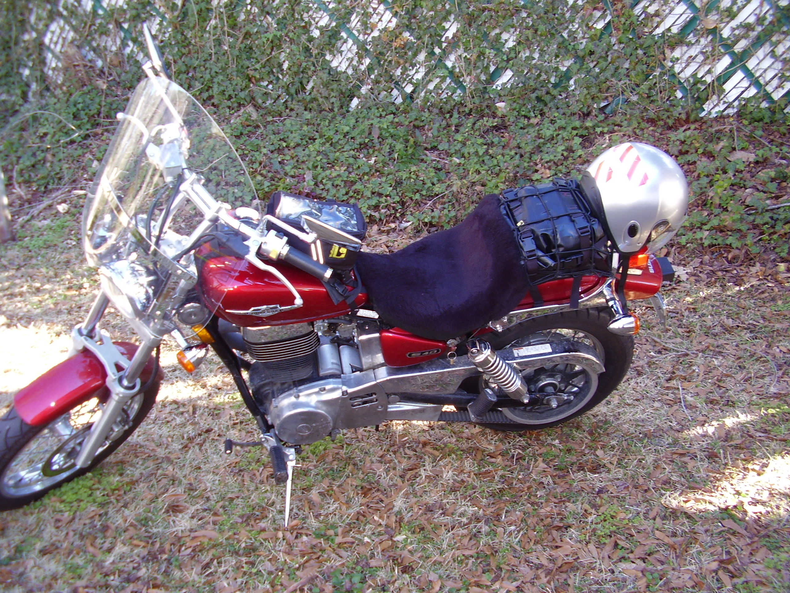 You need to remind me what you have done to your bike....is it stock, windshield, bobber, cafe, touring cruiser...how big you are.  I can't remember?