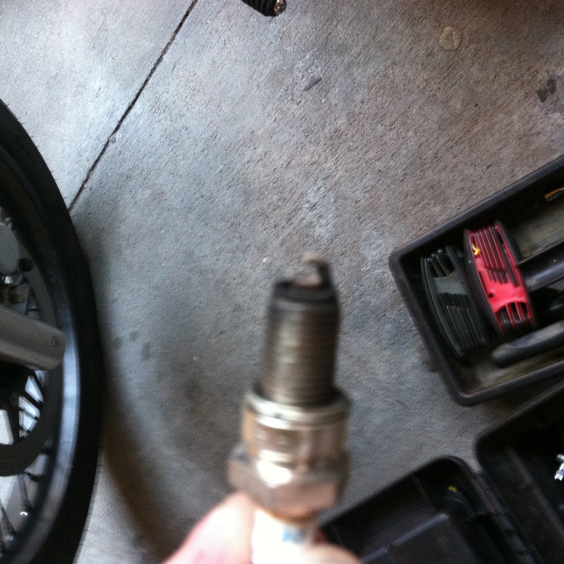 Bought the bike partially finished with a ryca bobber kit. PO already drilled out the idle mixture block off so I'm sure it's been adjusted. Just changed the plug (sorry for blurry pic my camera on the phone has cracks) I'm not sure if the carb is jetted that's the next step getting inside it and checking to see what jets are in there. Bike seems to drop and surge at about 1/4 turn on the throttle when cruising. Idles ok it's a little splotchy at times. Does seem as if she runs a little on the hot side which from what I've read would suggest a lean setup. It's a 96 stock engine ryca header and short funnel exhaust. Has a k&n cone filter that from the looks needs cleaning or replaced. Open up the throttle and the ass dyno says she's fine but it's just got an annoying miss at constant throttle about 1/4 to half turn. I'm still going through her and cleaning up half ass installs and get it done fast so I can ride work. Just installed the new cam chain tensioner from Verslagen1 and saved myself a headache.
