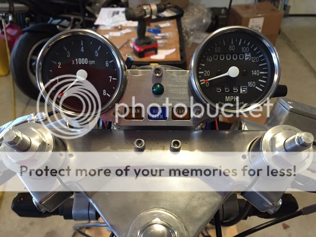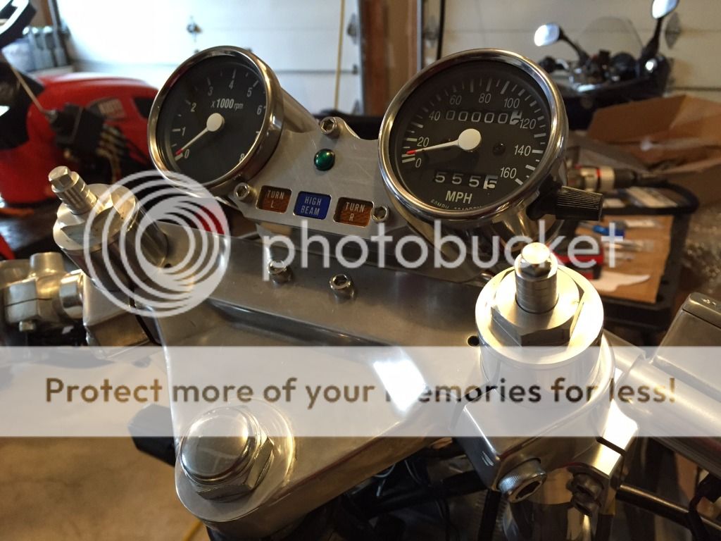 When I decided to modify a lower triple clamp into an upper I also at the same moment resigned myself to finding my own solution to attach the speedo and tach to the bike. I fabricated an approach out 6061 bar stock that worked just fine, but I had always admired Gerry’s custom instrument cluster. I noticed one day Gerry volunteered in his builder’s log that’d he’d be happy to build upper triple clamps for members…so I thought “I wonder if he’d be willing to build another instrument cluster”. So I asked – and he did.