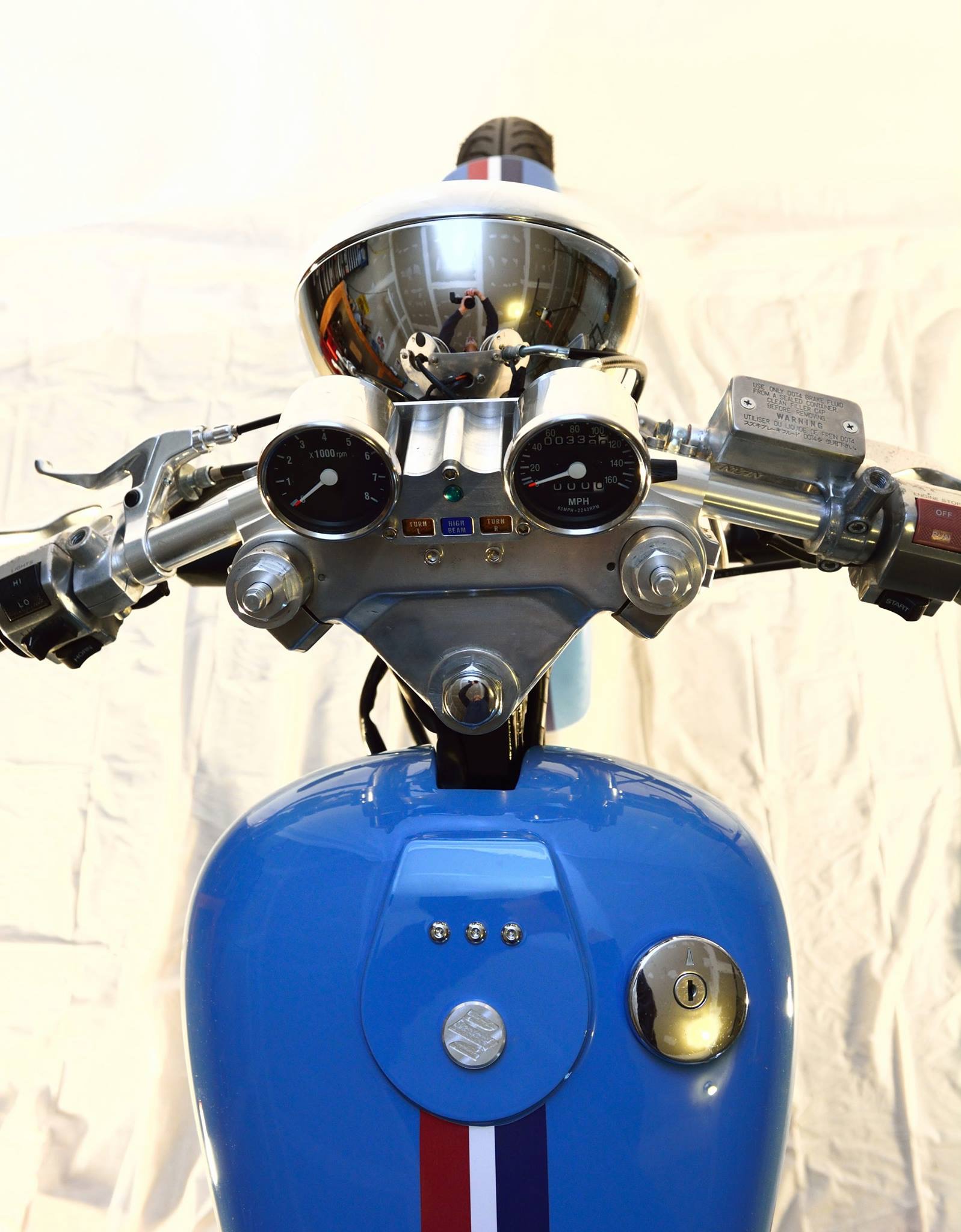 The gauges sit in a custom housing that holds the indicators that were originally in the speedometer. The housing is attached to custom upper triple clamp (that was formerly a lower triple clamp) via a simple aluminum bracket.
