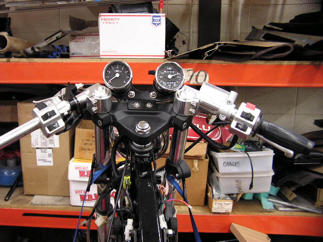 clip ons now moved to the top of the tree. I will have to remove the gauges to top off the fork oil, but no biggie.