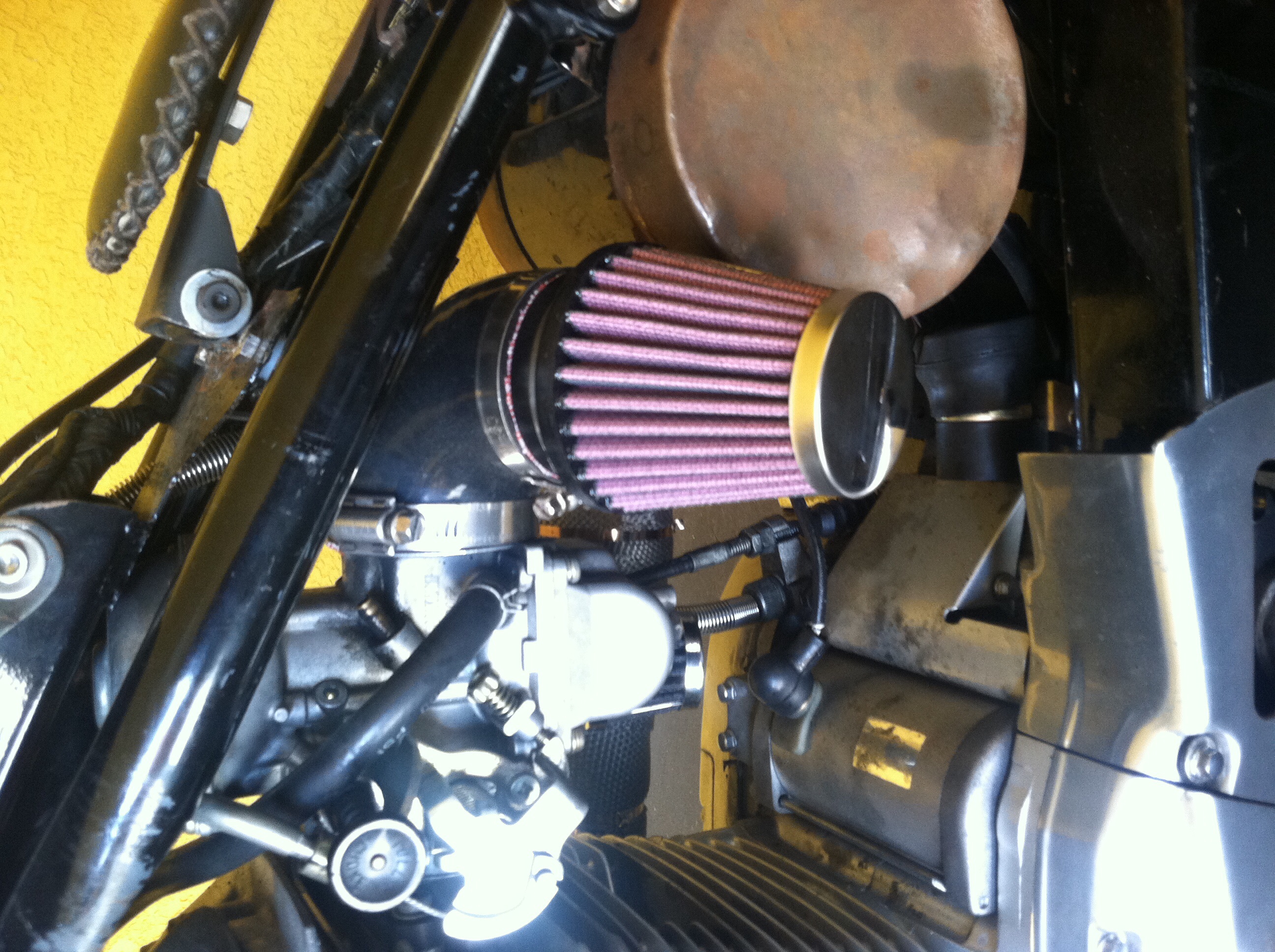 @Serowbot here is a pic of the filter setup. It's the RYCA elbow for the cafe builds. I didn't like how the cone was basically stuffed between the underside of the solo seat and the fake oil can for electronics. This change did nothing however with the way it's running. If anything it actually helped a small amount.