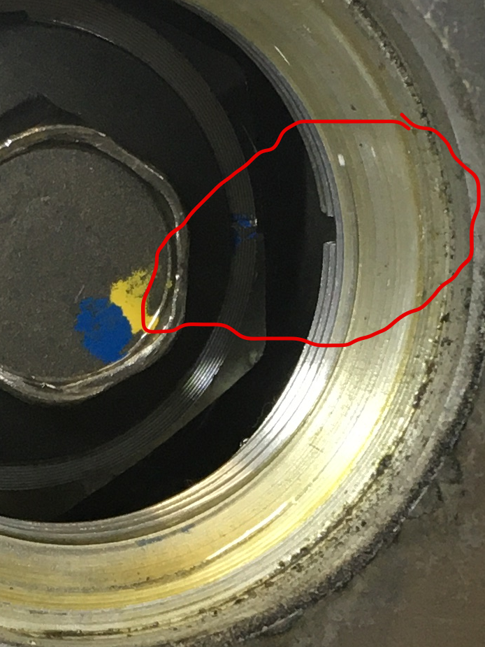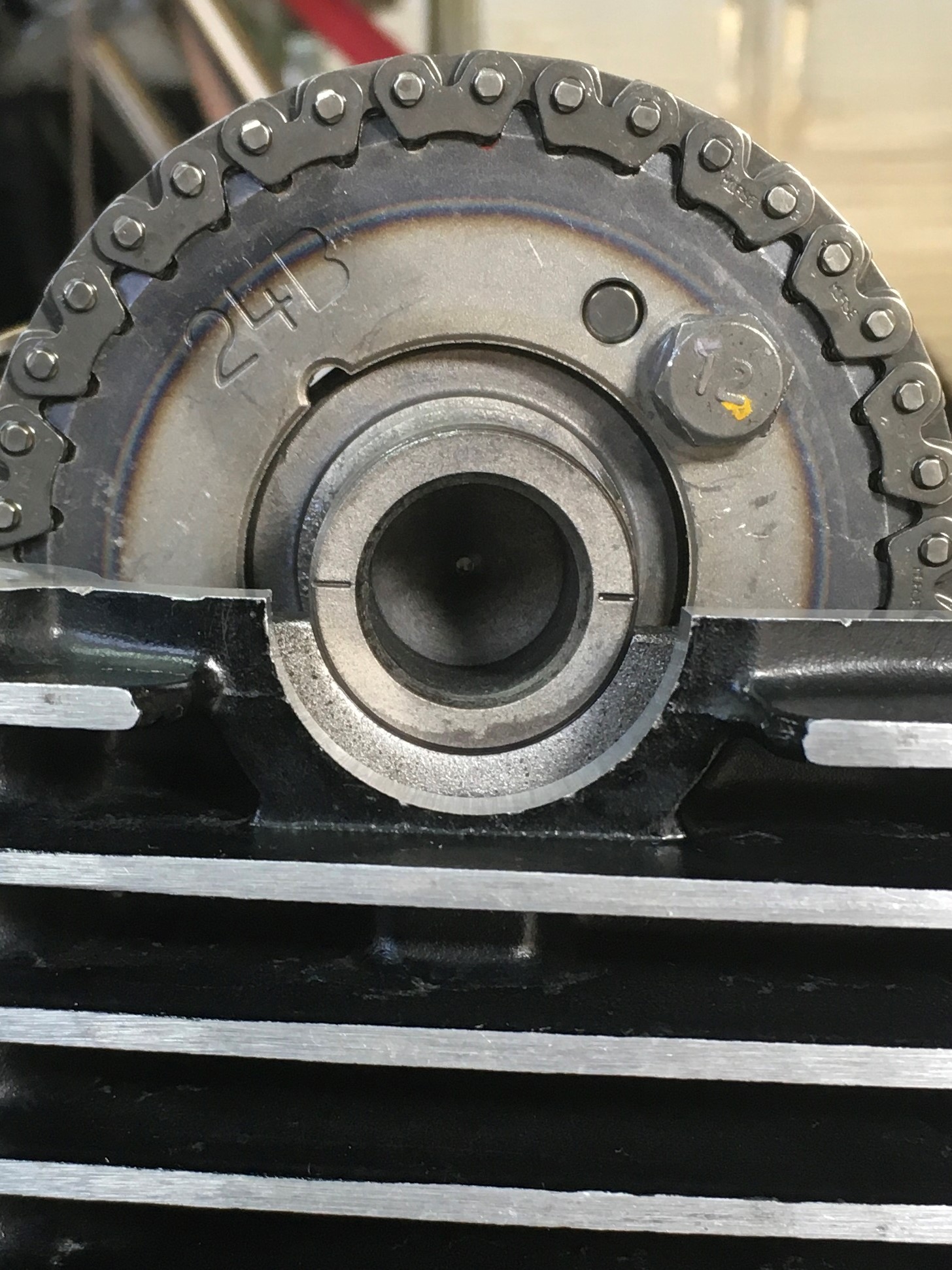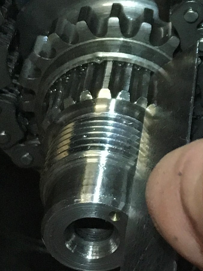 Here's another shot of misaligned timing marks, the sprocket must be moved three-splines clockwise to properly align the marks.