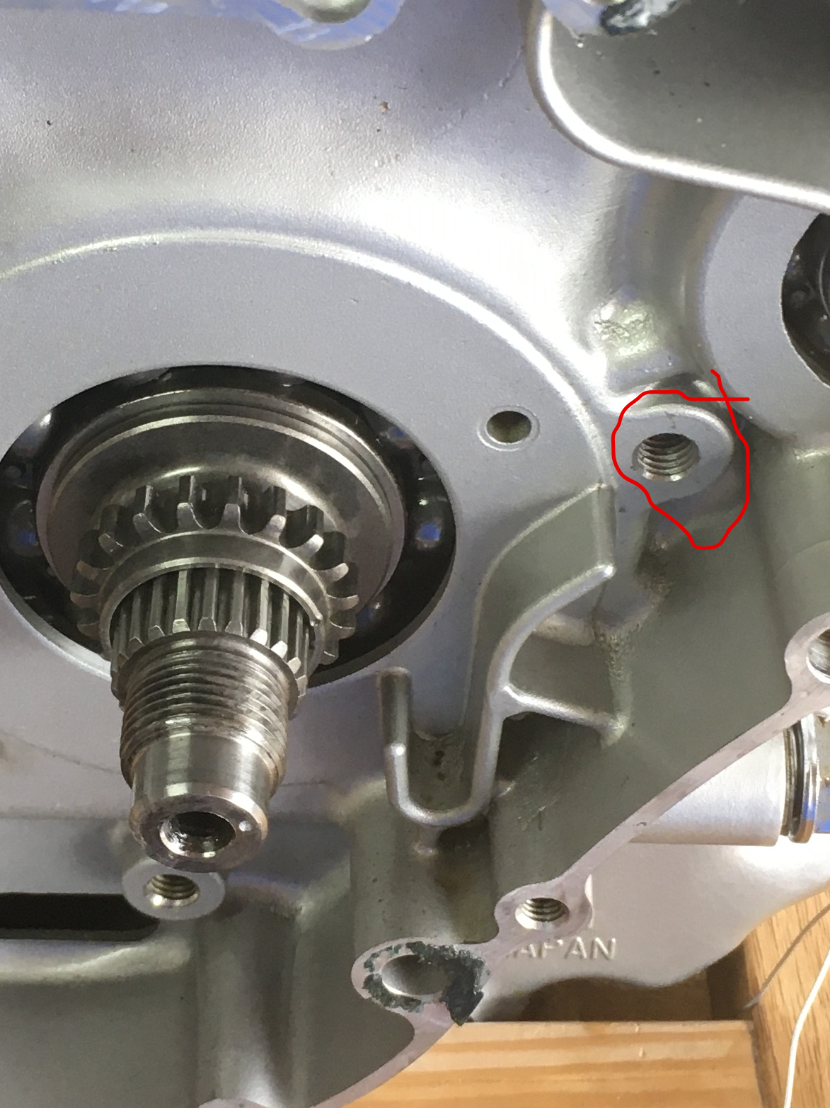 Once it is positioned at TDC, you can lock the crankshaft by installing an 8mm bolt in the threaded hole on the right hand side of the case.  Do not tighten with a wrench.  Just tighten with your fingers.  That will be sufficient to keep the crank from rotating  Tighten the bolt with your fingers until you feel the bolt touch the side of the crankshaft, then turn it clockwise a little more (with your fingers, not a wrench) until the bolt is pressing hard on the crank.
