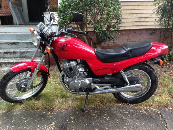 2007 Honda Nighthawk 250 with under 5,000 miles. Drove it home yesterday and it rides perfectly. New tires, center stand (aftermarket, still in the box), new battery and all maintenance done locally by Team Powersports in Garner NC. Bike is fun to drive and will serve as my MSC training bike.