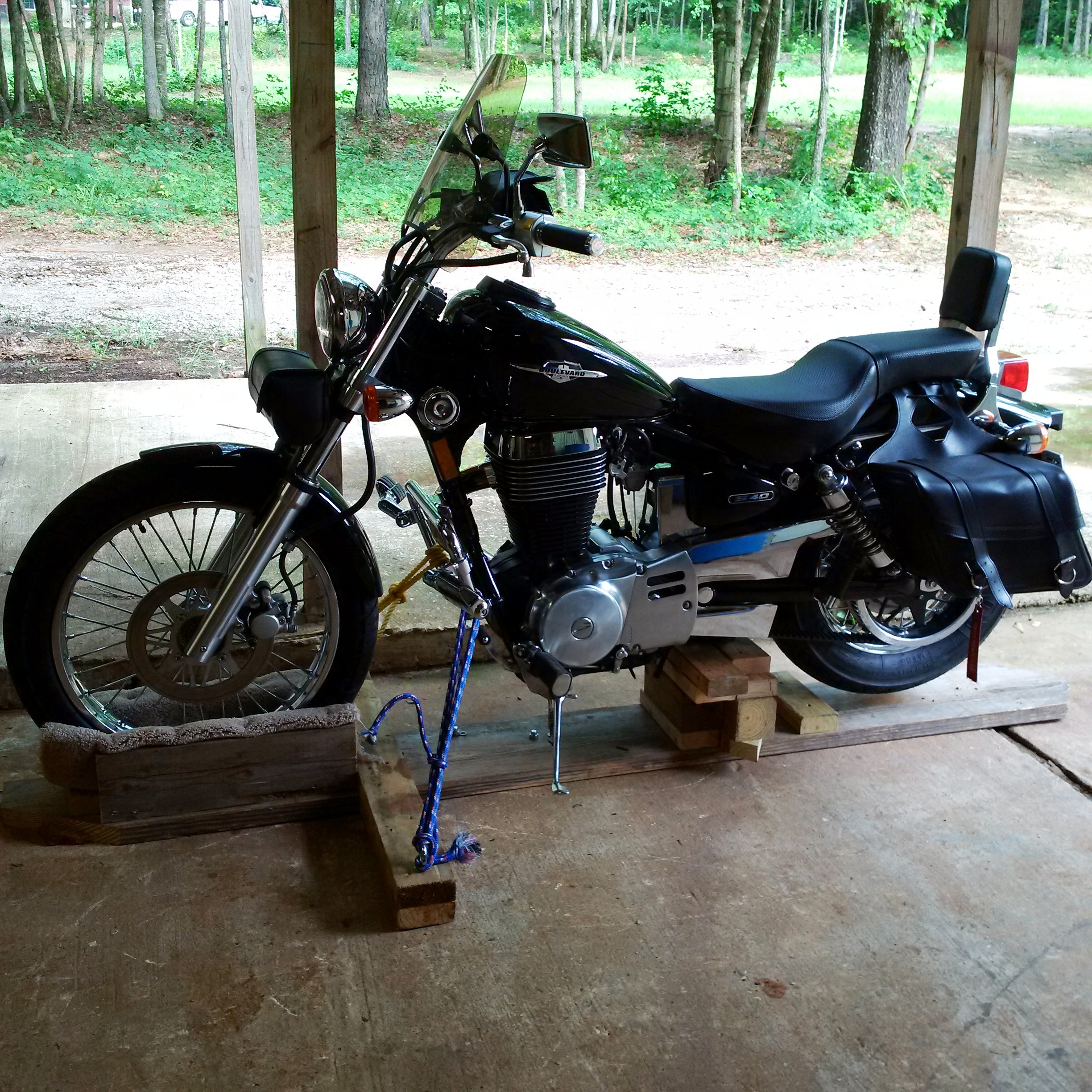 And, when I need to work on it off of the kick stand, I just roll up into it and temporarily tie the bike down as seen.