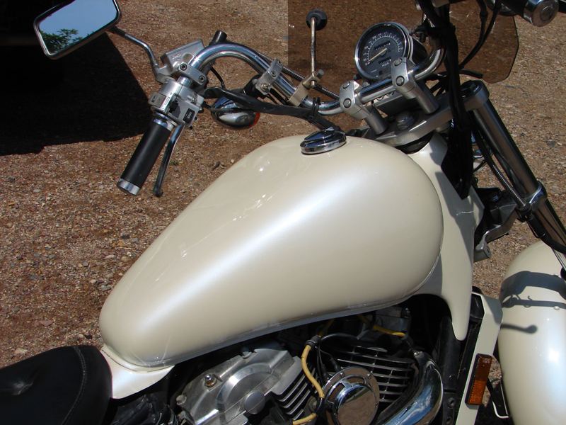 Strang, I appreciate the feedback. You can't tell in the pics but the oem red tank is scratched up, far from a nice finish, part of the reason I got the bike so cheap. Otherwise I wouldn't mind keeping it a bit longer. I guess I could plastidip the tank black or white first to see what it looks like and if I don't like it I can peel it off...