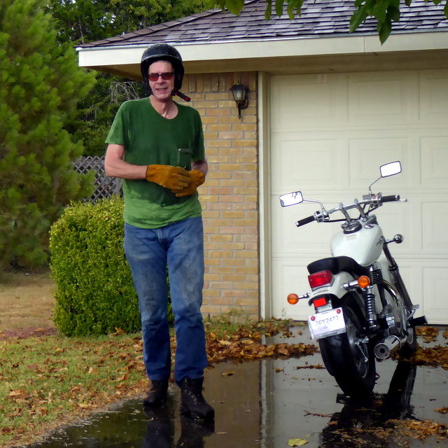 I got 22 miles from home when it just started raining. Not a downpour mind you, but it was a light steady rain. I am not embarrassed to admit I was a bit concerned. I had ZERO experience with wet pavement. None, nada, zip. There are few cars on the road in my rural community that late in the evening, so traffic wasnt an issue. I just didnt like the way the bike cornered at all. Long curves I might normally take at 45, I slowed it down to 30 or so and dropped a gear. The tires didnt feel like they were sticking to the road and I was worried about having the ass end slide out.