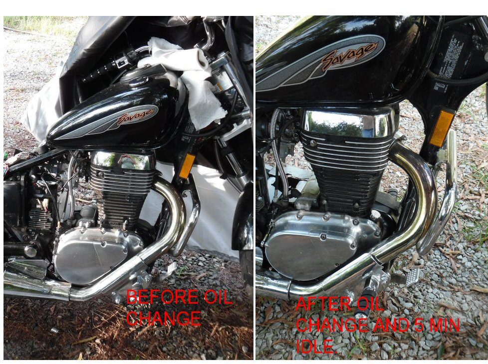About 4 weeks ago I started her up, let her idle for about 5 mins, then shut her down. I waited at least 15 minutes and then pulled the oil drain plug. The plug was still so hot you could not hold it in your hand. After the oil drained out with the bike more or less level, I re-installed the drain plug and put 2 bottles of Suzuki brand 10-40 oil. I didnt change the filter. I swapped the standard oil filler cap for a bling cap with the Suzuki logo on it, but that is the only thing I did "mechanically" to the engine.
