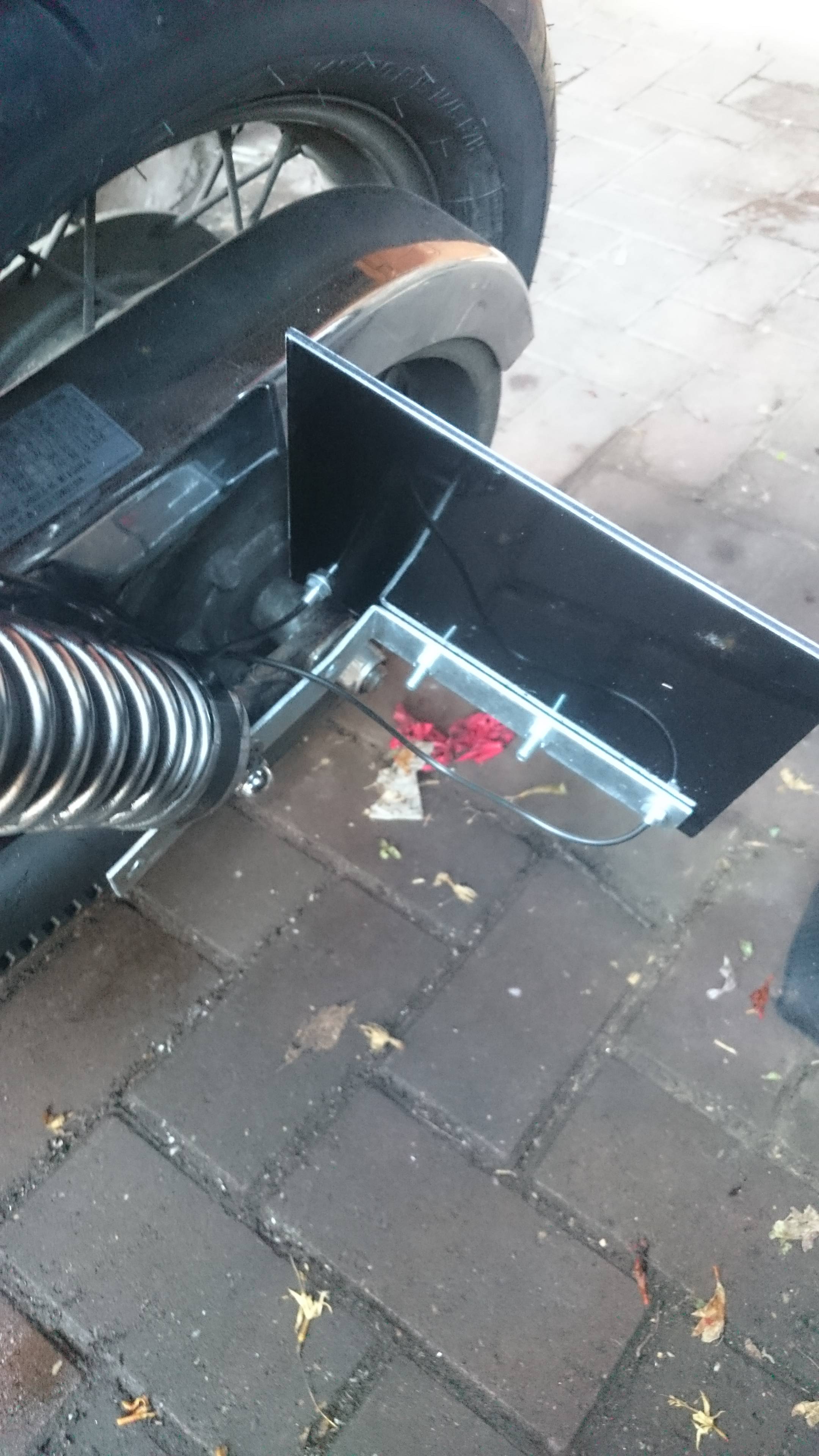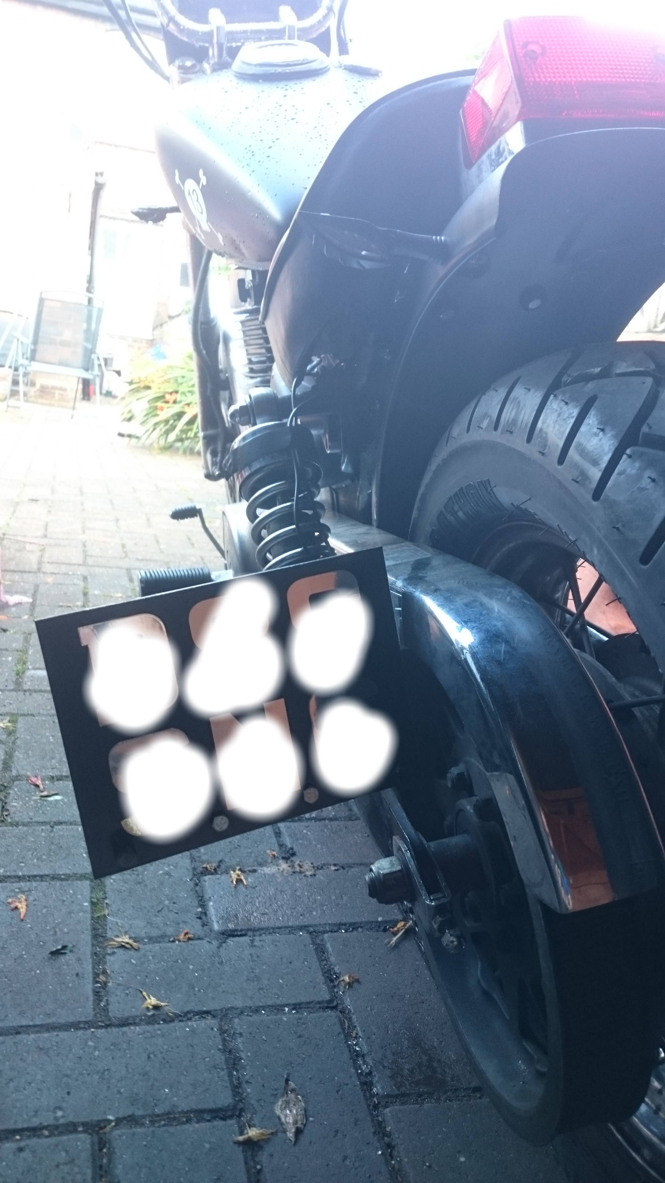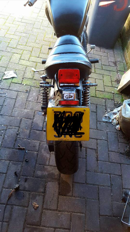 Number plate mount from rear. It's ghetto I know but works and cost 60p! The wire is for number plate lights [img][/img]