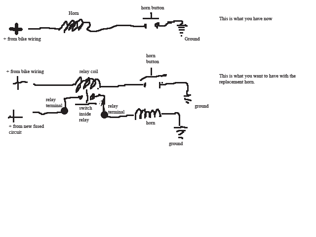 Pressing the horn button, using the stock wiring, closes the relay protecting the switch from burning out.  Then the heavier new wire would carry the needed power to the upgraded horn.