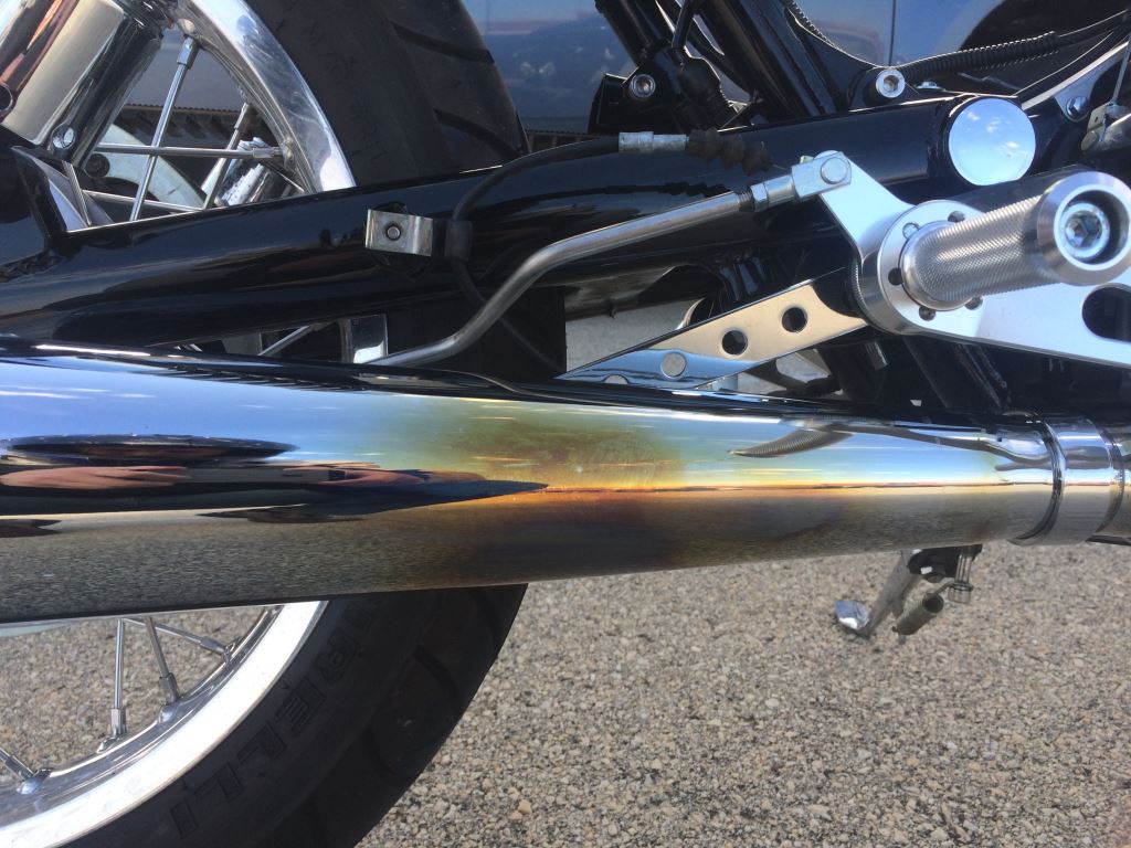 When chrome gets hot is turns blue from oxidation that occurs. I don't know if the quality of chrome has any effect on how fast that can happen, or if "chrome" composition can very much. The header pipe has an inner and outer pipe that reduces the temperature of the outside (chrome) portion of the pipe....as the hot exhaust is in the inner pipe.