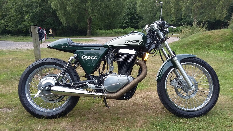 I am not sure the 3" swing arm extension is a good thing. The rear tire is already set back a bit too far to look good with the length of the RYCA fuel tank and seat. Adding another 3" may make it look like those folks who extend the swing arms on their sport bikes and make them into.....drag racers (I don't like that look). Also it requires the use of a chain/sprocket conversion - and since the Cafe' bike uses longer shocks and the sprockets are a smaller diameter - the chain will rub on the top of the swing arm at the pivot point....and the 3" extension will only make this situation worse (and the rear-set brackets are in the way and have to be notched for a chain conversion). And.....this extension will shift even more weight onto the front wheel.....and in Cafe' form I believe that there might already be enough weight moved up front.