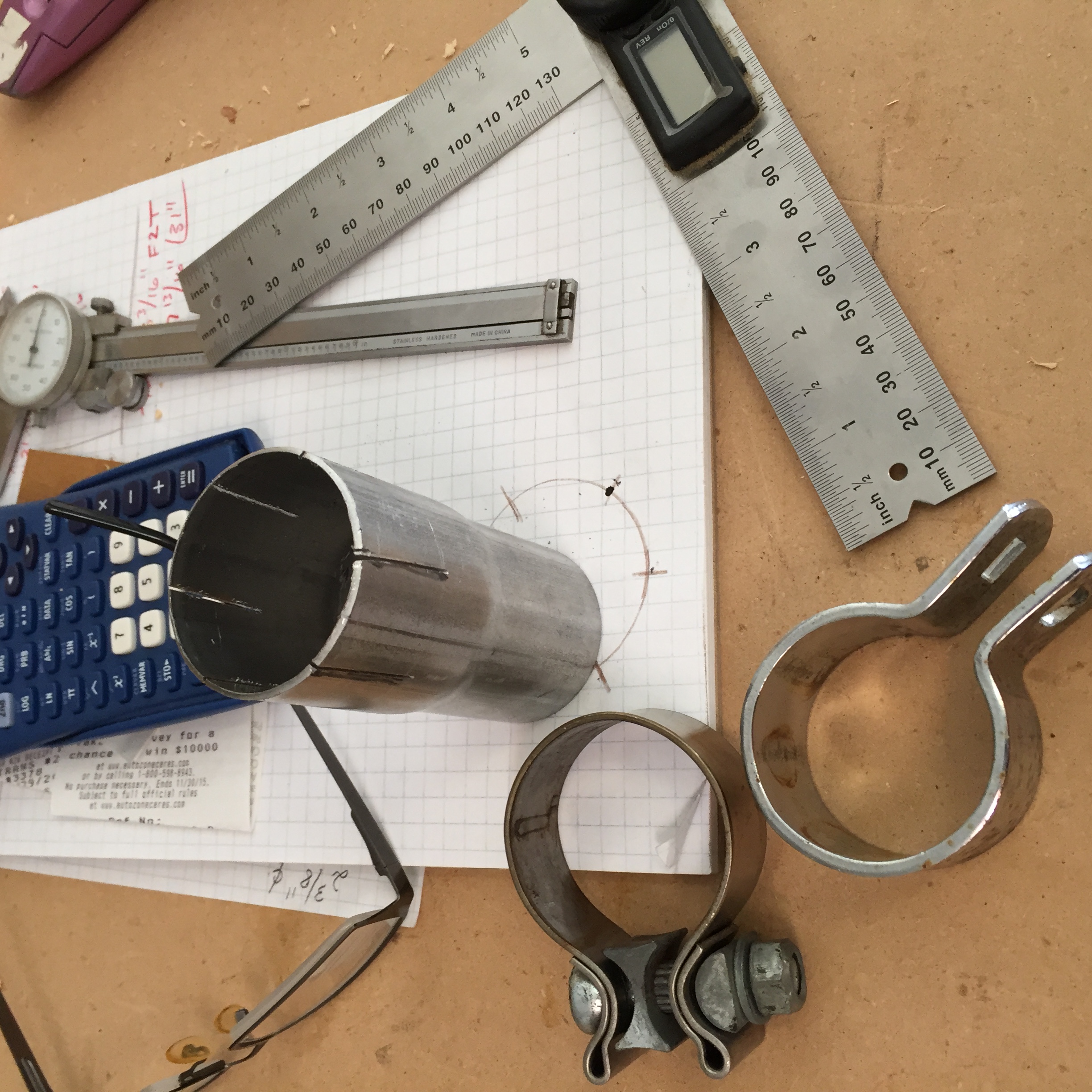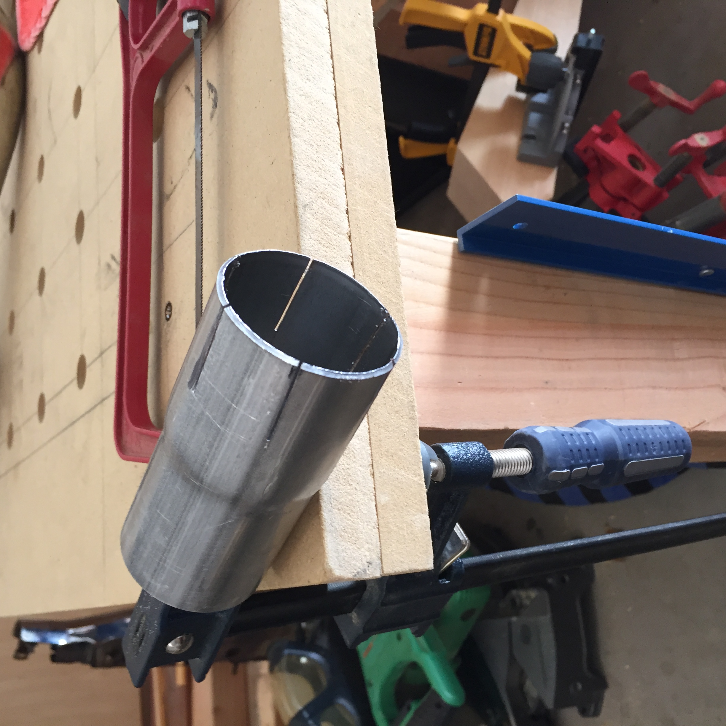 the finished cuts with clamps (both are from the Harley Dyna muffler off eBay) -
